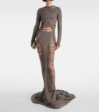 Aptly nicknamed The Lord of Darkness, Rick Owens brings gothic and industrial inspiration to avant-garde design. Crafted from wool, this top features a rolled boat neck, open rib knit pattern and all-over distressed effect. Product Details - Material: 100% virgin wool - Care instructions: dry clean - Made in Italy - Designer color name: Dust - Item color: gray - Item number: P01037999 Size & Fit - True to size - Semi-sheer - Fitted - Non-stretchy fabric - Slightly cropped - The model seen in the picture is 178cm-5'10" and wearing a size XS