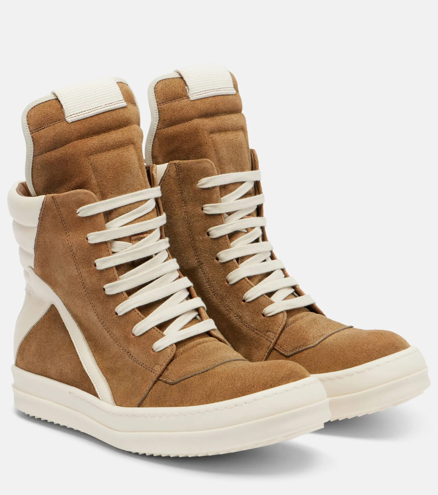 Rick Owens defines avant-garde design through architectural silhouettes, dark romanticism, and uncompromising craftsmanship. The Geobasket sneakers are crafted from supple suede with leather trims and boast high-top silhouettes. Product Details - Upper: calf leather (suede) - Lining: calf leather - Sole: leather insole, rubber sole - Color: brown - Toe shape: round toe - Made in Italy - Includes: shoe box, dust bag - Designer color name: Sumi Brown/Milk/Milk - Closure: lace-up - Item number: P01149152 Size & Fit - True to size - European sizes