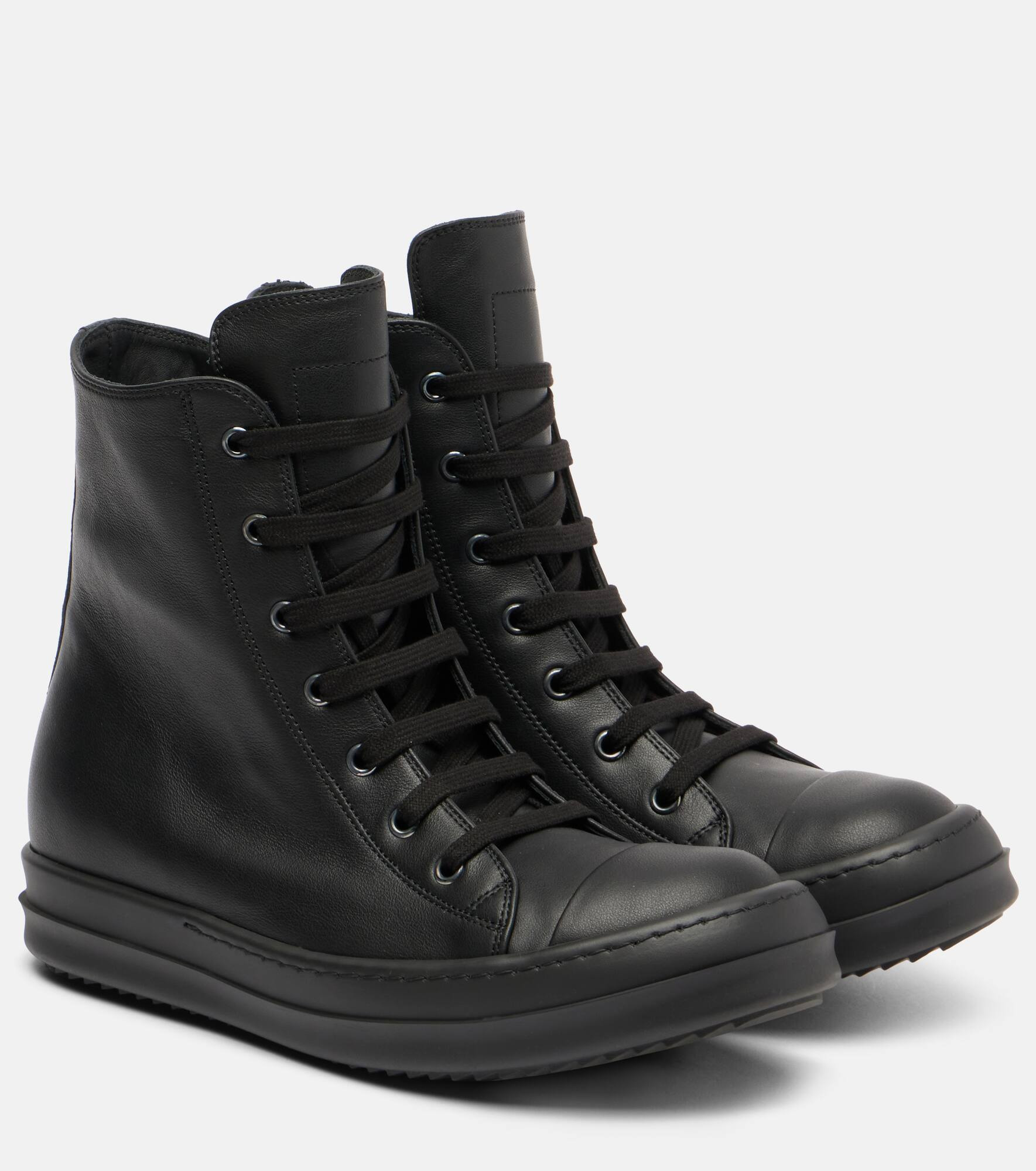 Sneakers enthusiasts will love this Rick Owen's subversive take on this classic design. The High Top Sneaks are crafted from black leather and feature tonal rubber soles. Product Details - Upper: leather - Lining: leather - Sole: leather insole, rubber sole - Toe shape: round toe - Made in Italy - Includes: shoe box, dust bag, extra laces - Designer color name: All Black - Item color: black - Closure: drawstring, zipped side - Item number: P01086393 Size & Fit - True to size - European sizes - 3cm-1" platform (size EU 38) - 4cm-1.5" wedge heel (size EU 38)