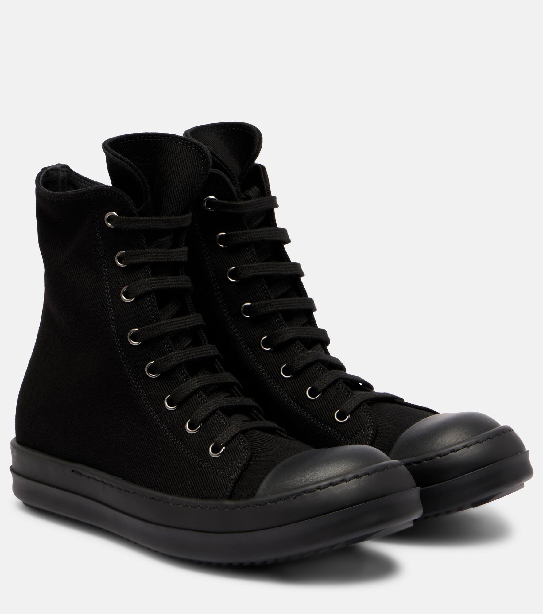 Aptly nicknamed The Lord of Darkness, Rick Owens brings gothic and industrial inspiration to avant-garde design. The iconic Hollywood sneakers are a high-top design with classic lacing and oversized tongues. Product Details - Upper: fabric, rubber - Lining: fabric - Sole: rubber insole and sole - Toe shape: round toe - Made in Italy - Includes: shoe box, dust bag - Designer color name: All Black - Item color: black - Closure: zipped side - Hardware color: silver - Item number: P01097764 Size & Fit - True to size - European sizes - 3,5cm-1.5" platform (size EU 38)