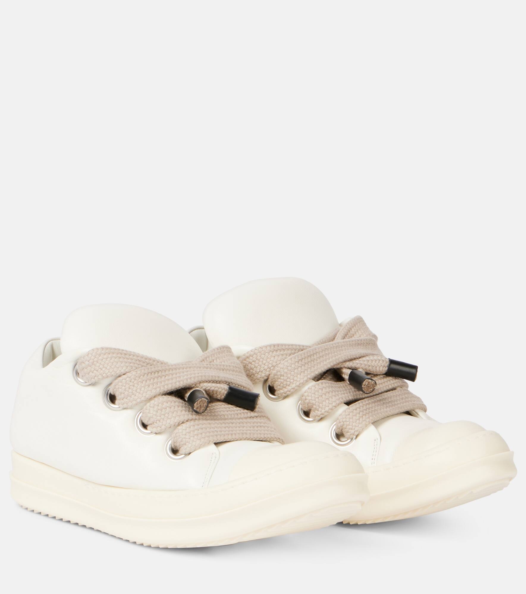 From the SS25 Hollywood Runway collection, Rick Owens' Jumbolace sneakers blend bold style with avant-garde design. Their sleek leather uppers are complemented by slightly raised toes, chunky rubber soles, and exaggerated laces. Product Details - Upper: leather - Lining: leather - Sole: leather insole, rubber sole - Toe shape: almond toe - Made in Italy - Includes: shoe box, dust bag - Designer color name: Milk/Milk/Milk - Item color: white - Closure: lace-up - Hardware color: silver - Item number: P01048320 Size & Fit - True to size - Slightly wide at the toe - European sizes - 3cm-1" platform (size EU 38) - 3,5cm-1.5" wedge heel (size EU 38)