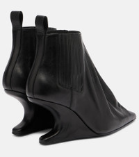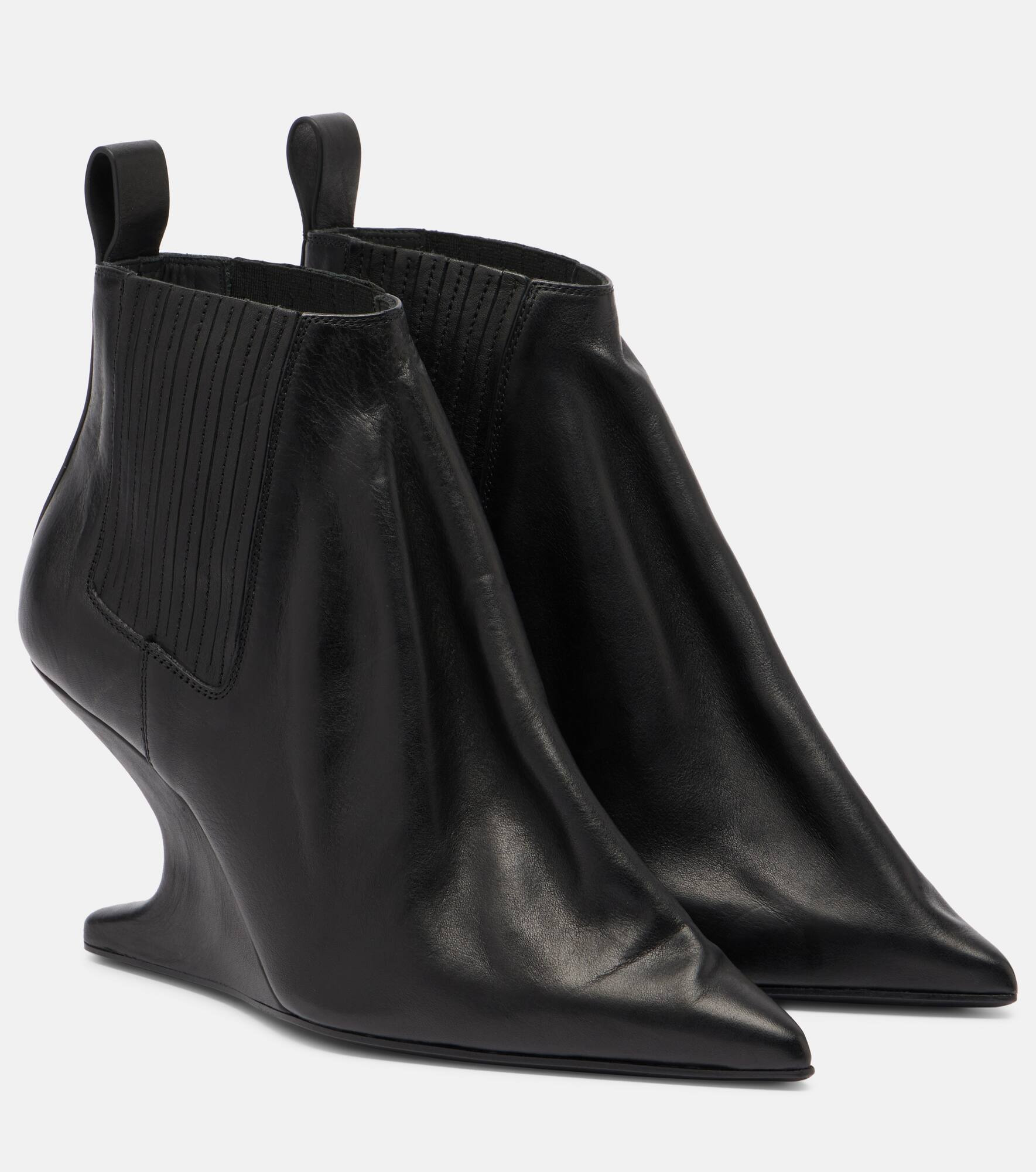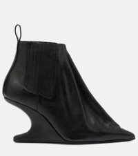 Aptly nicknamed The Lord of Darkness, Rick Owens brings gothic and industrial inspiration to avant-garde design. Made in Italy from black leather, these ankle boots are characterized by cantilever wedges, tonal pull tabs, and pointed toes. Product Details - Upper: leather - Lining: leather - Sole: leather insole, leather and rubber sole - Toe shape: pointed toe - Made in Italy - Includes: shoe box, dust bag - Designer color name: Black - Item color: black - Item number: P01097996 Size & Fit - True to size - European sizes - 9cm-3.5" heel (size EU 38)