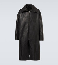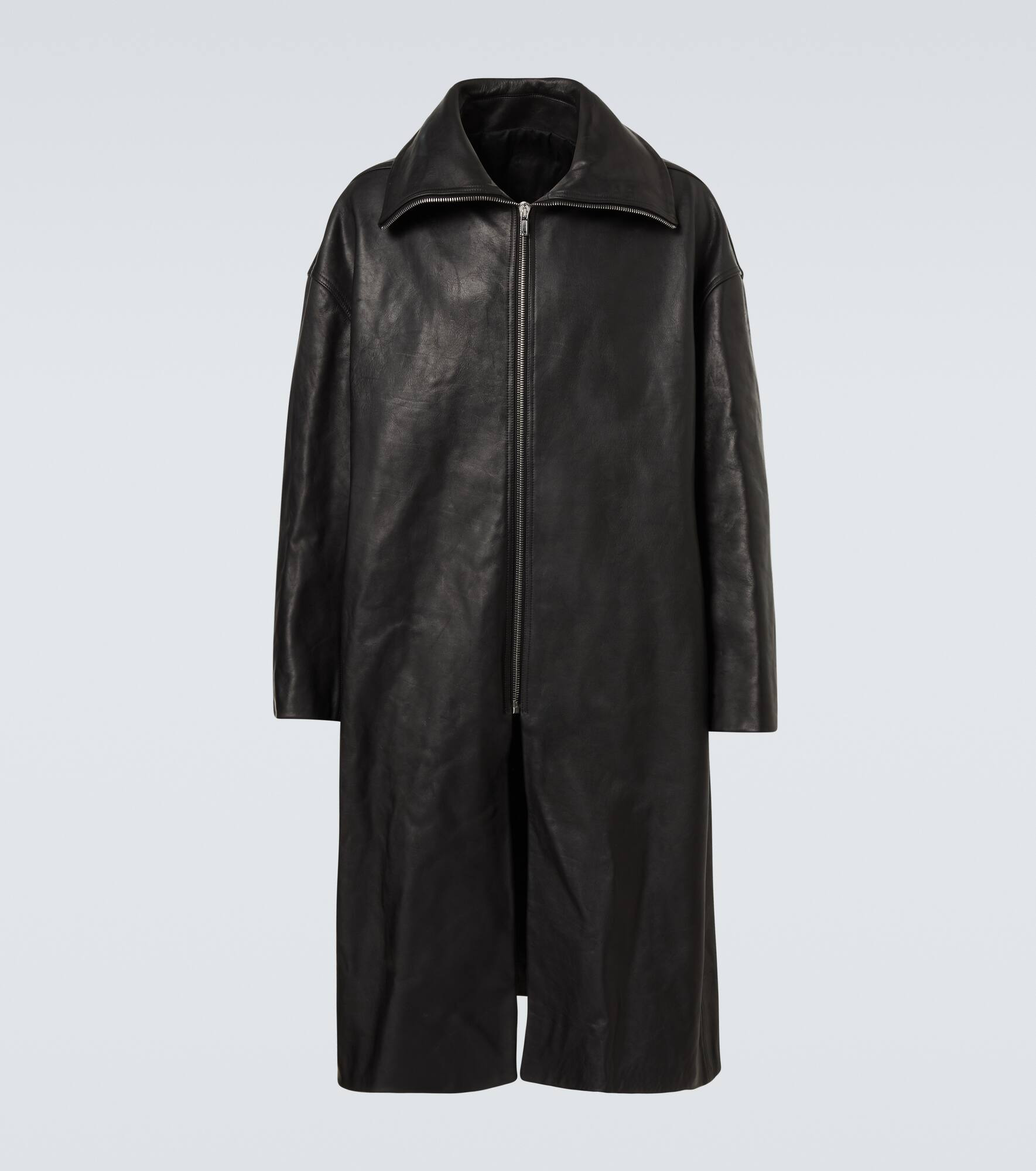 Aptly nicknamed The Lord of Darkness, Rick Owens brings gothic and industrial inspiration to avant-garde design. The fully lined leather coat features a zipped front, slant and internal pockets, a classic collar, and a single back vent. Product Details - Material: 100% calf leather - Care instructions: specialist clean - Made in Moldova - Designer color name: Black - Item color: black - Lining: 100% cotton - Sleeve lining: 100% cupro - Details: 100% horn - Contains non-textile parts of animal origin - Closure: zipped front - Collar: turtleneck - Pockets: slant pockets, internal pockets - Vent: single - Fully lined - Item number: P01057190 Size & Fit - True to size - Dropped shoulders - Oversized - Non-stretchy fabric - The model in the picture is 185cm-6'1" and wearing a size IT 52