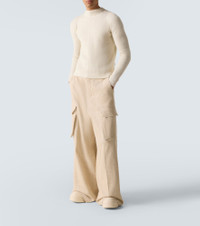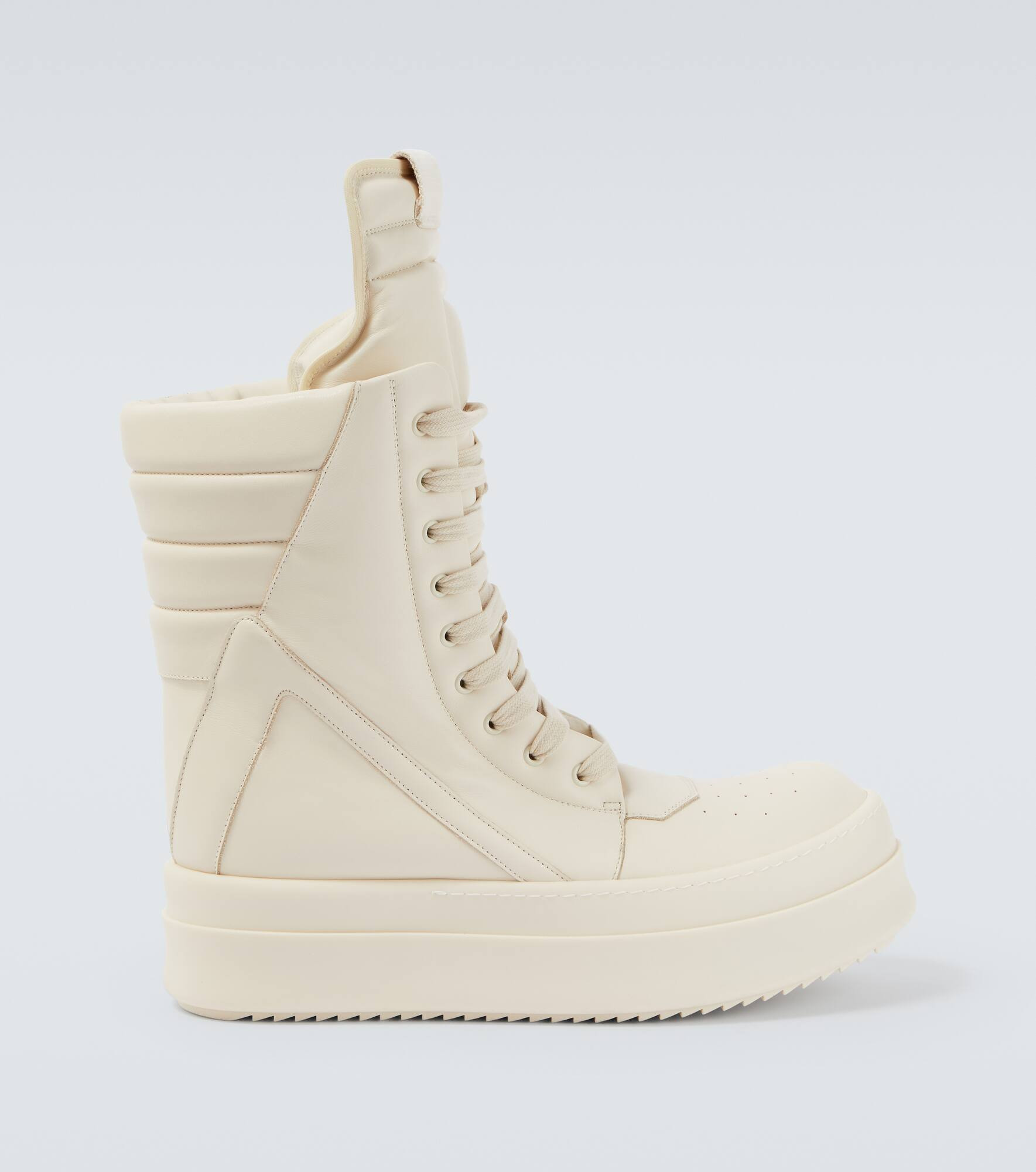 Rick Owens reimagines the classic Geobasket with exaggerated proportions and signature detailing. Featuring mid-calf height and shark-toothed soles, these leather Megageobaskets sneakers deliver bold volume with sculptural impact. Product Details - Upper: leather - Lining: calf leather - Sole: leather insole, rubber sole - Toe shape: round toe - Made in Italy - Includes: shoe box, dust bag, extra laces - Designer color name: Indigo/Milk/Milk - Item color: white - Closure: lace-up - Item number: P01057217 Size & Fit - Fits small to size - we recommend trying one size larger - Half sizes please take the next size up - European sizes