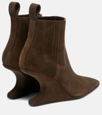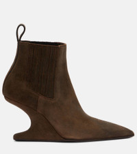 Aptly nicknamed The Lord of Darkness, Rick Owens brings gothic and industrial inspiration to avant-garde design. Made in Italy from brown suede, these ankle boots are characterized by cantilever wedges, tonal pull tabs, and pointed toes. Product Details - Upper: leather (suede) - Lining: leather - Sole: leather insole, leather and rubber sole - Toe shape: pointed toe - Made in Italy - Includes: shoe box, dust bag - Designer color name: Indigo - Item color: brown - Item number: P01097995 Size & Fit - True to size - European sizes - 9cm-3.5" heel (size EU 38)
