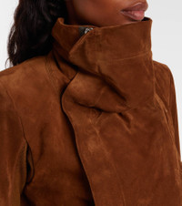 Aptly nicknamed The Lord of Darkness, Rick Owens brings gothic and industrial inspiration to avant-garde design. This sleek jacket is crafted from supple brushed suede and features an offset zipped front and extra long sleeves. Product Details - Material: 100% lamb leather (suede) - Care instructions: specialist clean - Made in Italy - Designer color name: Chestnut - Item color: brown - Trim: 100% virgin wool - Lining: 100% cotton - Sleeve lining: 100% cupro - Details: 100% water-buffalo horn - Hardware color: silver - Closure: zipped front - Shoulder pads - Pockets: zipped pockets, internal pockets - Fully lined - Item number: P01068203 Size & Fit - True to size - Shoulder pad inserts - Cinched waist - Non-stretchy fabric - Slightly cropped - The model seen in the picture is 178cm-5'10" and wearing a size IT 40