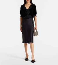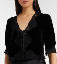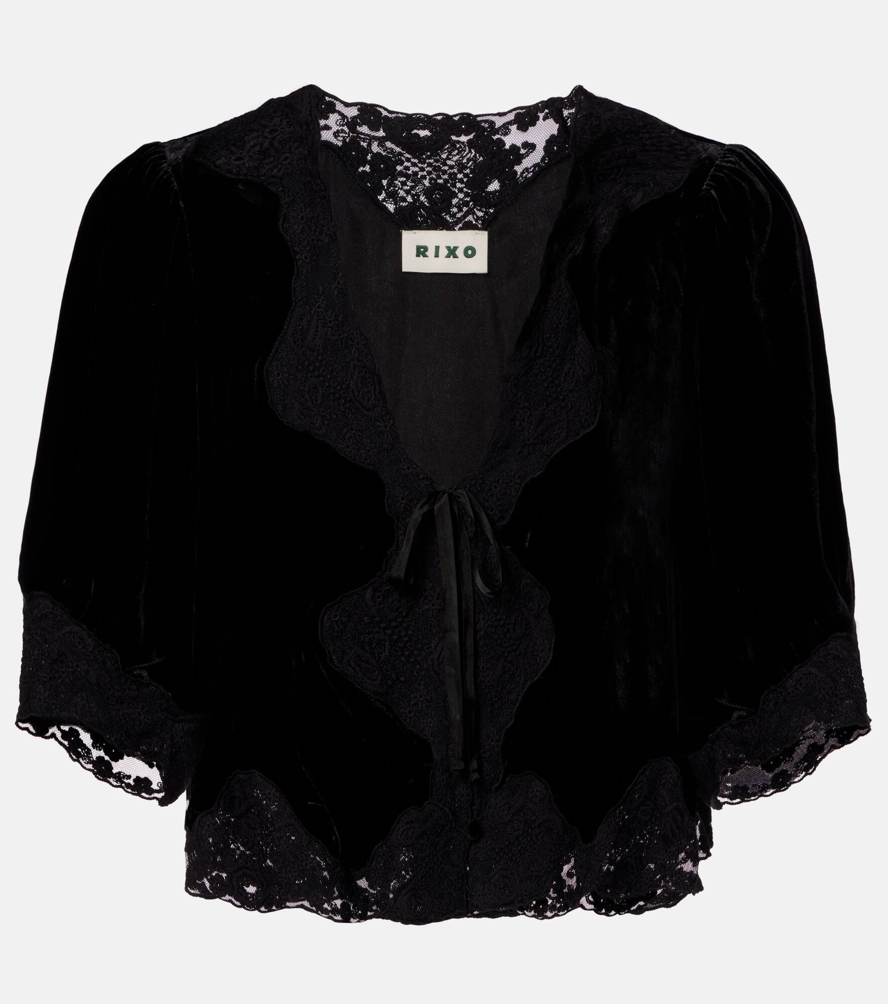 Forget the endless search for hidden gems, Rixo's vintage-inspired designs deliver ample retro charm. Made from velvet, the Ursula top features charming lace trims, elbow-length sleeves, and a self-tie V-neckline. Product Details - Material: 81% viscose, 19% silk - Care instructions: dry clean - Made in China - Designer color name: Black - Item color: black - Trim: 79% cotton, 21% polyamide - Collar: V-neck - Closure: buttoned front, self-ties - Item number: P01104150 Size & Fit - True to size - Designed for a loose fit - Non-stretchy fabric - Slightly cropped - The model seen in the picture is 178cm-5'10" and wearing a size XS