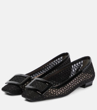 A house signature, Roger Vivier’s Belle Vivier ballet flats show the enduring allure of ‘60s design cues. Defined by iconic square buckles, the style features embroidered mesh uppers and patent leather trims. Product Details - Upper: fabric - Lining: leather - Sole: leather insole and sole - Toe shape: square toe - Made in Italy - Designer color name: Nero - Comes with a box - Comes with dust bag - Item number: P00834334 Size & Fit - Fits slightly large to size - we recommend trying a half size smaller - European sizes - 2cm-1" heel (size EU 38)