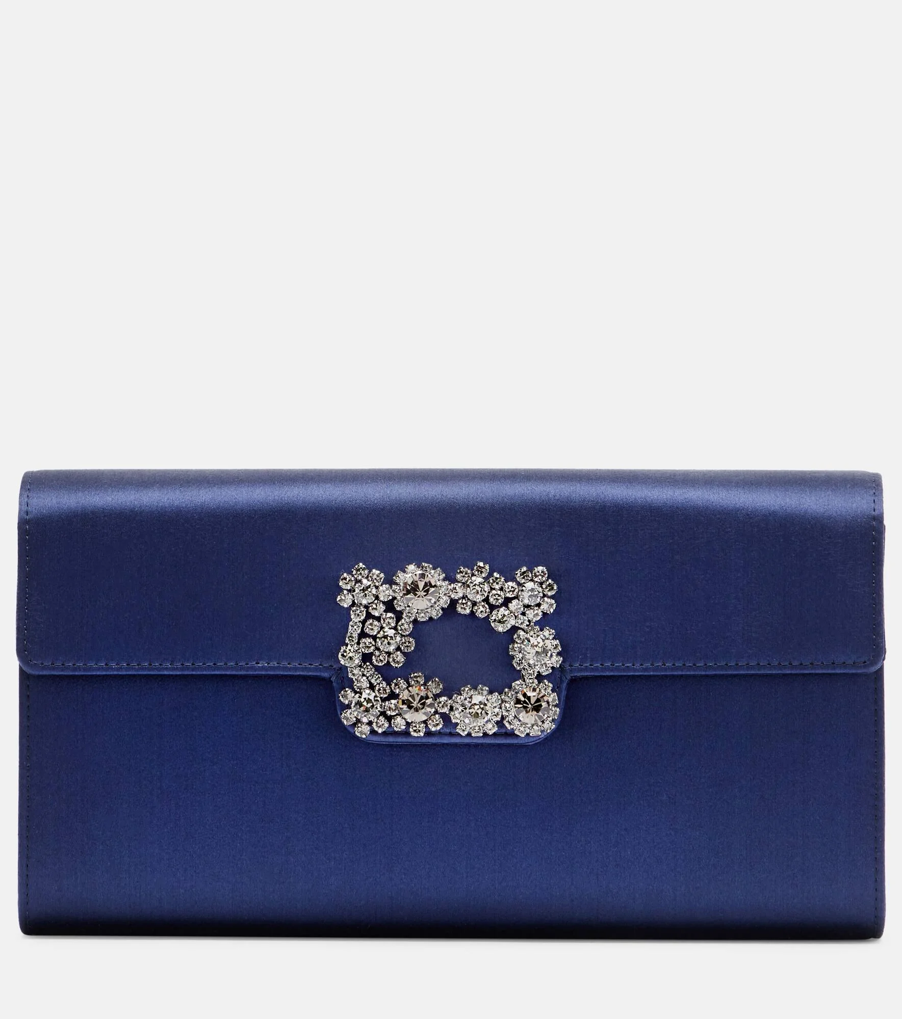 Adorned by luminous crystals, Roger Vivier's Efflorescence buckle lends shimmer and sophistication to this clutch. Primed for special events, the design is made from lustrous satin and comes with a chain strap. Product Details - Material: silk - Lining: fabric - Made in Italy - Color: blue - Designer color name: Blu Navy - Closure: magnetic fastening - Chain shoulder strap - Internal details: two internal compartments - Includes: box, dust bag - Item number: P01129922 Size & Fit - Height 13cm-5" - Width 24cm-9.5" - Depth 3cm-1" - Chain length 116cm-45.5"