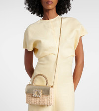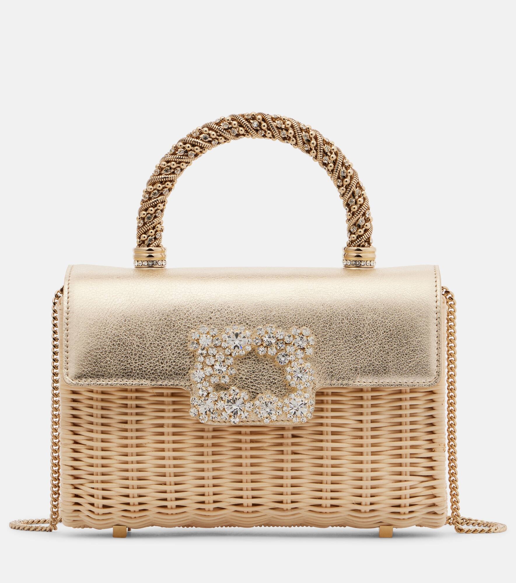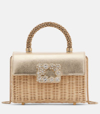 The Jewel Efflorescence Mini tote bag from Roger Vivier features a crystal-embellished buckle. The design has a rattan body with a leather flap, an ornate top handle, and a chain shoulder strap. Product Details - Material: leather, rattan - Lining: leather - Made in Italy - Designer color name: Naturale Oro - Item color: gold, beige - Top handle, Chain shoulder strap - Color of chain strap: gold - Internal details: card slot - Closure: magnetic fastening - Includes: box, dust bag - Item number: P01041293 Size & Fit - Height 13,5cm-5.5" - Width 19,5cm-7.5" - Depth 4,5cm-2" - Chain length 121cm-47.5" - Length of handles 22cm-8.5"