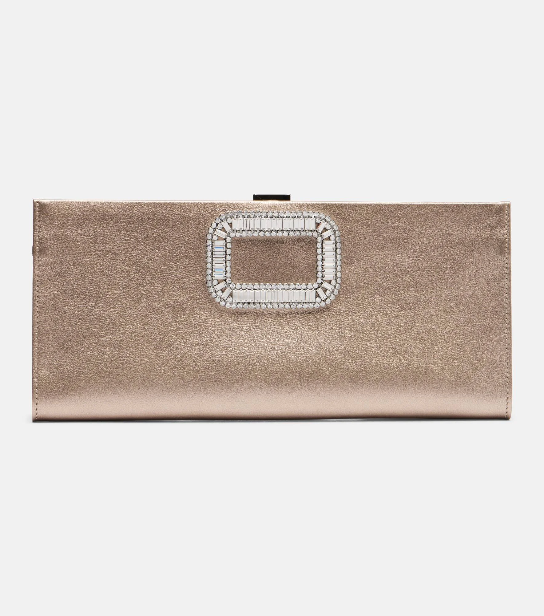 Roger Vivier's designs have achieved icon status, immediately recognizable by their signature square buckle. The Pilgrim Small clutch is made in Italy from leather with silver-toned hardware. Product Details - Material: calf leather - Lining: fabric - Made in Italy - Designer color name: Talco - Item color: beige - Hardware color: silver - Closure: snap-clasp fastening - Includes: dust bag, box - Item number: P01106379 Size & Fit - Clutch height 12cm-4.5" - Clutch width 27cm-10.5"