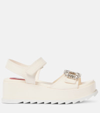 Rely on the Slidy Viv' wedge sandals from Roger Vivier for an edgy take on warm-weather footwear. The pair is crafted from leather, secures with VELCRO® fastenings, and is topped with crystal embellishments. Product Details - Upper: leather - Lining: leather - Sole: leather insole, rubber sole - Toe shape: square open toe - Made in Italy - Includes: shoe box, dust bag - Designer color name: Cire - Item color: ivory - Closure: VELCRO® fastening - Hardware color: silver - Item number: P01048183 Size & Fit - Fits small to size - we recommend trying one size larger - European sizes - 4cm-1.5" platform (size EU 38) - 6,5cm-2.5" wedge heel (size EU 38)