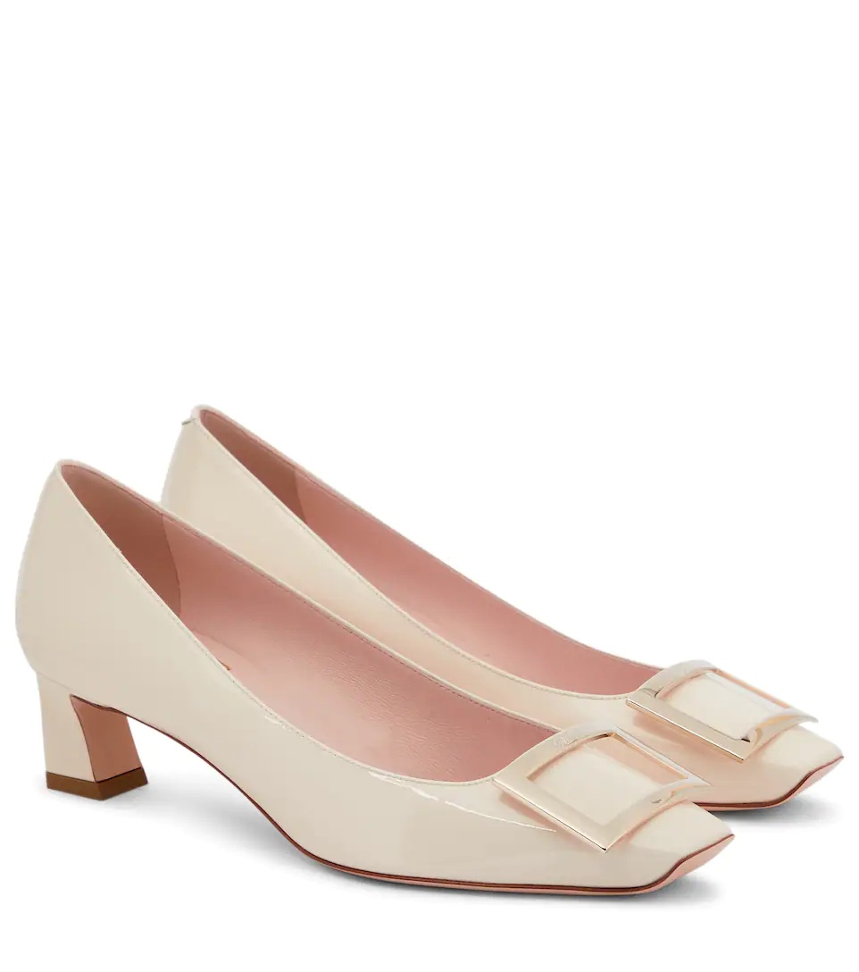 Accent your work wardrobe with Roger Vivier's Trompette pumps. In smooth, chic white patent leather, accented with modest slanted heels and metallic buckles, they'll prove an easy pick for instant glamour. Product Details - Lining: leather - Toe shape: square toe - Sole: leather insole, leather and rubber sole - Upper: leather - Comes with dust bags - Comes with a box - Made in Italy - Item number: P00703842 Size & Fit - Fits slightly large to size - we recommend trying a half size smaller - European sizes - 4,5cm-2" heel (size EU 38)