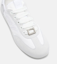 Roger Vivier infuses each pair of shoes with a joyful, decorative spirit. The Viv Low sneakers are crafted from satin and boast suede trims, complete with a monogram embroidery on each side. Product Details - Upper: leather (suede), fabric - Lining: fabric - Sole: leather insole, rubber sole - Toe shape: round toe - Made in Italy - Includes: shoe box - Designer color name: Bianco - Item color: white - Hardware color: silver - Closure: lace-up - Item number: P01082877 Size & Fit - True to size - European sizes - 2cm-1" wedge heel (size EU 38)