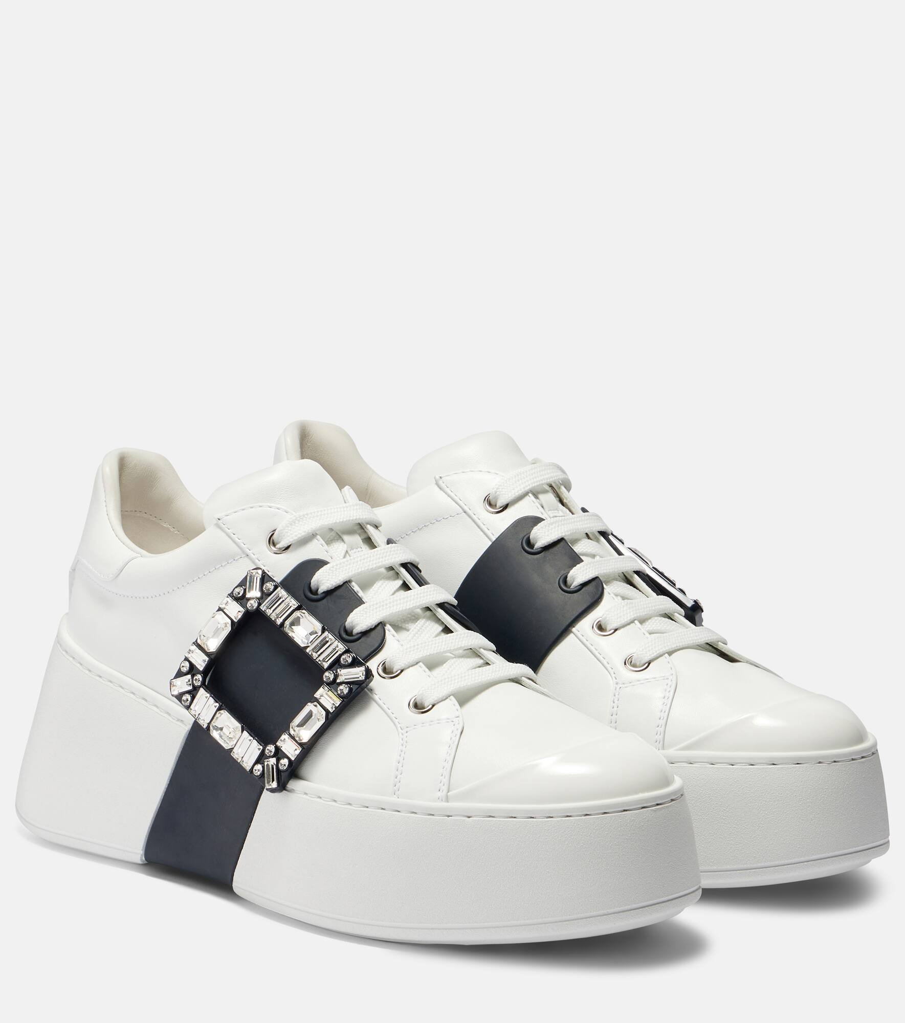 Roger Vivier makes your sneaker rotations a decadent affair with this white and blue Viv Skate design. Made from smooth calfskin leather, this pair rests on chunky platforms and is framed with signature buckles at the sides, which are embellished with crystals. Product Details - Upper: leather - Lining: leather - Sole: leather insole, rubber sole - Toe shape: round toe - Made in Italy - Includes: extra laces, shoe box - Designer color name: Altraversioni + Fascia Indigo - Item color: white, blue - Item number: P01082860 Size & Fit - True to size - European sizes - 6cm-2.5" platform (size EU 38) - 8cm-3" wedge heel (size EU 38)