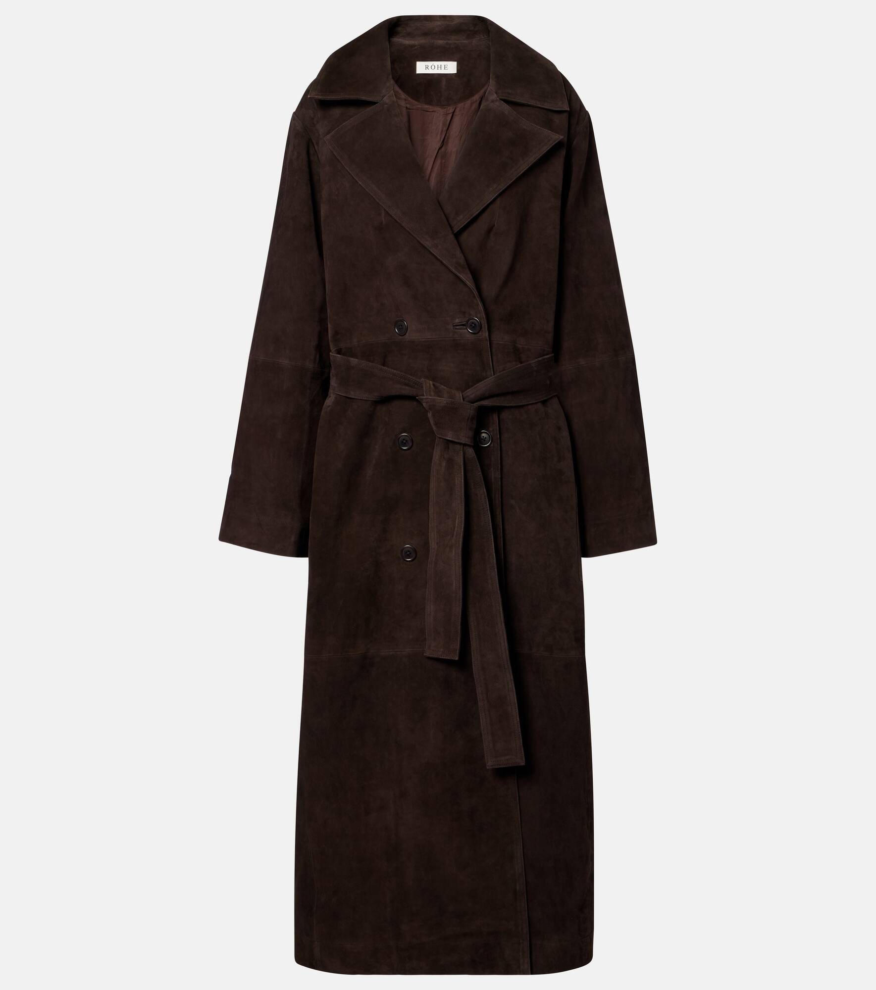 This coat from Rohe is a refined choice for when temperatures drop. Crafted from luxurious suede, this belted piece features a clean, minimal silhouette in a chocolate brown hue. Product Details - Material: 100% goat leather (suede) - Care instructions: specialist clean - Made in India - Designer color name: Dark Chocolate - Item color: brown - Lining: 100% viscose - Closure: double-breasted (six buttons) - Pockets: patch pockets - Belt loops - Detachable belt - Vent: single - Item number: P01073338 Size & Fit - True to size - Loose fit, comes with belt - Non-stretchy fabric - The model seen in the picture is 178cm-5'10" and wearing a size FR 34
