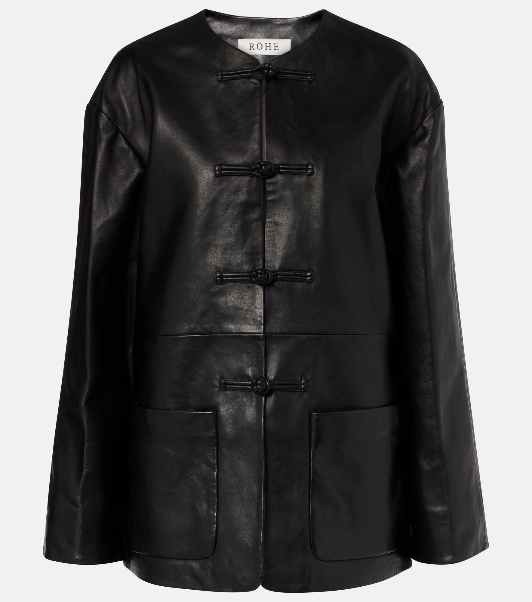 Not a simple leather jacket, this piece from Rohe boasts a striking silhouette with toggle fastenings at the front. Crafted from soft lamb leather, this style is complete with functional patch pockets. Product Details - Material: 100% lamb leather - Care instructions: specialist clean - Made in India - Designer color name: Black - Item color: black - Lining: 100% viscose - Closure: toggle fastenings - Pockets: patch pockets - Fully lined - Item number: P01073345 Size & Fit - True to size - Dropped shoulders - Designed for a loose fit - Non-stretchy fabric - Falls below the hip - The model seen in the picture is 178cm-5'10" and wearing a size FR 34