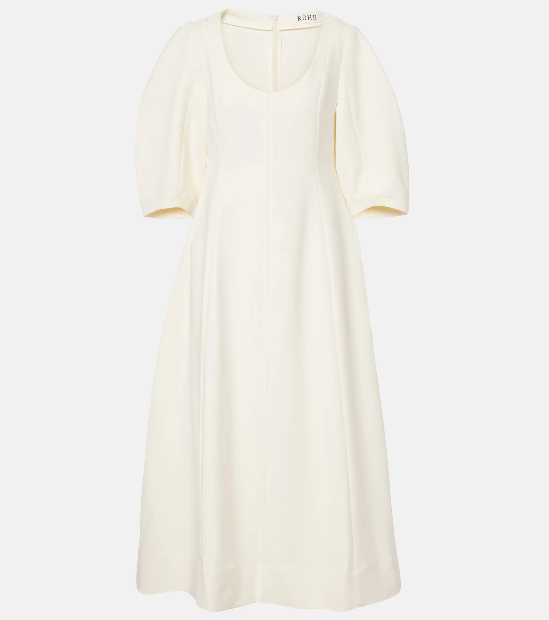 Transcend trends with Rohe's minimalist everyday staples. Primed for elegant looks, this midi dress features three-quarter sleeves, a sculptural waist, and a concealed zipper fastening. Product Details - Material: 97% viscose, 3% elastane - Care instructions: dry clean - Made in Lithuania - Color: white - Designer color name: Off White - Item color: white - Closure: concealed zipped back - Item number: P01140030 Size & Fit - True to size - Cinched waist - Non-stretchy fabric - The model seen in the picture is 178cm-5'10" and wearing a size FR 34
