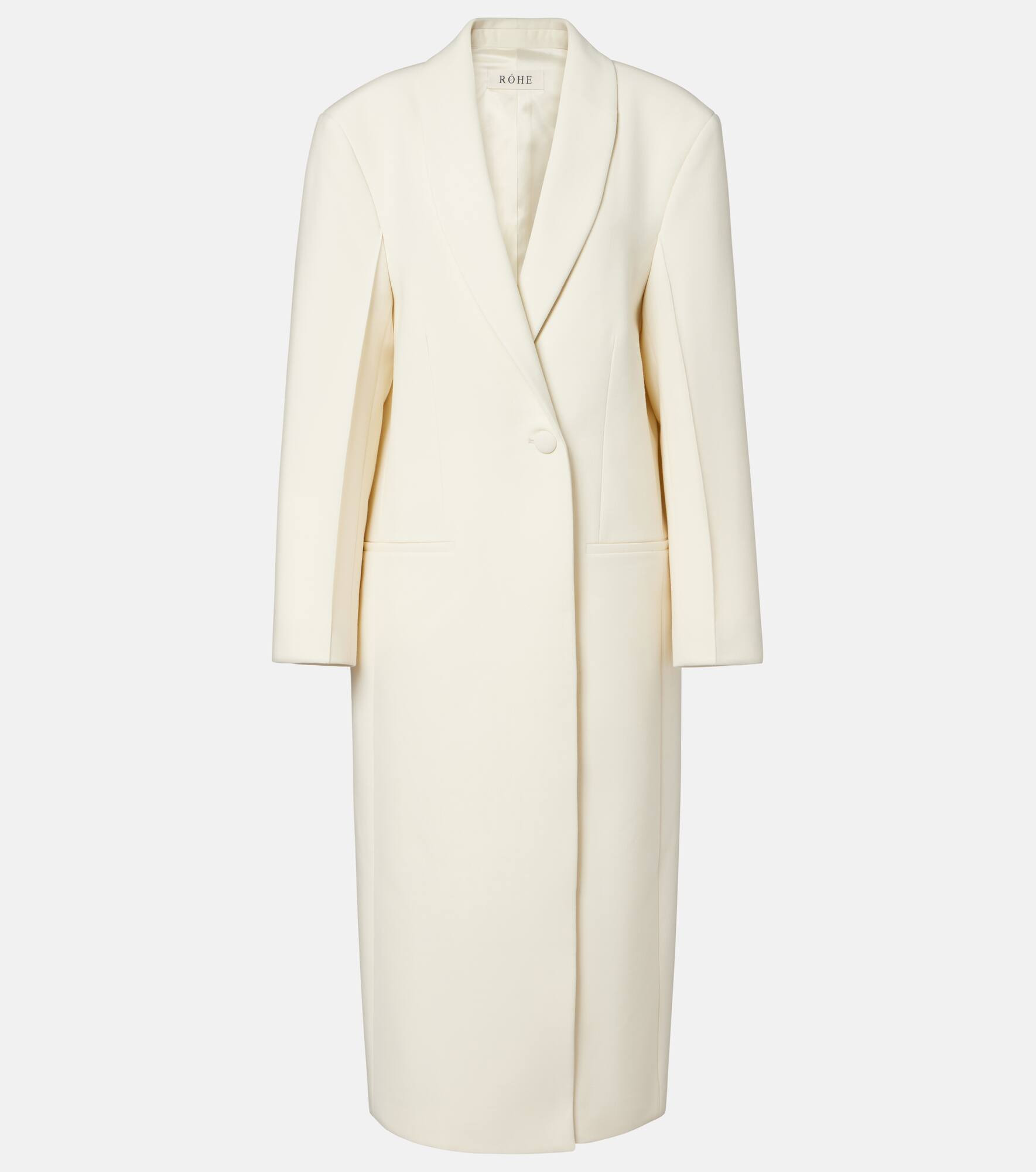 This coat from Rohe features a tailored, sleek silhouette perfect for elevated looks. The structured design is complete with a single-breasted lapel, welt pockets, and a center back slit. Product Details - Material: 53% polyester, 43% wool, 4% lyocell - Care instructions: dry clean - Made in Portugal - Designer color name: Ivory - Item color: white - Lining: 100% viscose - Closure: buttoned front - Shawl lapel - Pockets: welt pockets - Long vent - Item number: P01073435 Size & Fit - True to size - Shoulder pad inserts - Oversized - Non-stretchy fabric - slit length 46cm-18" - The model seen in the picture is 178cm-5'10" and wearing a size FR 34