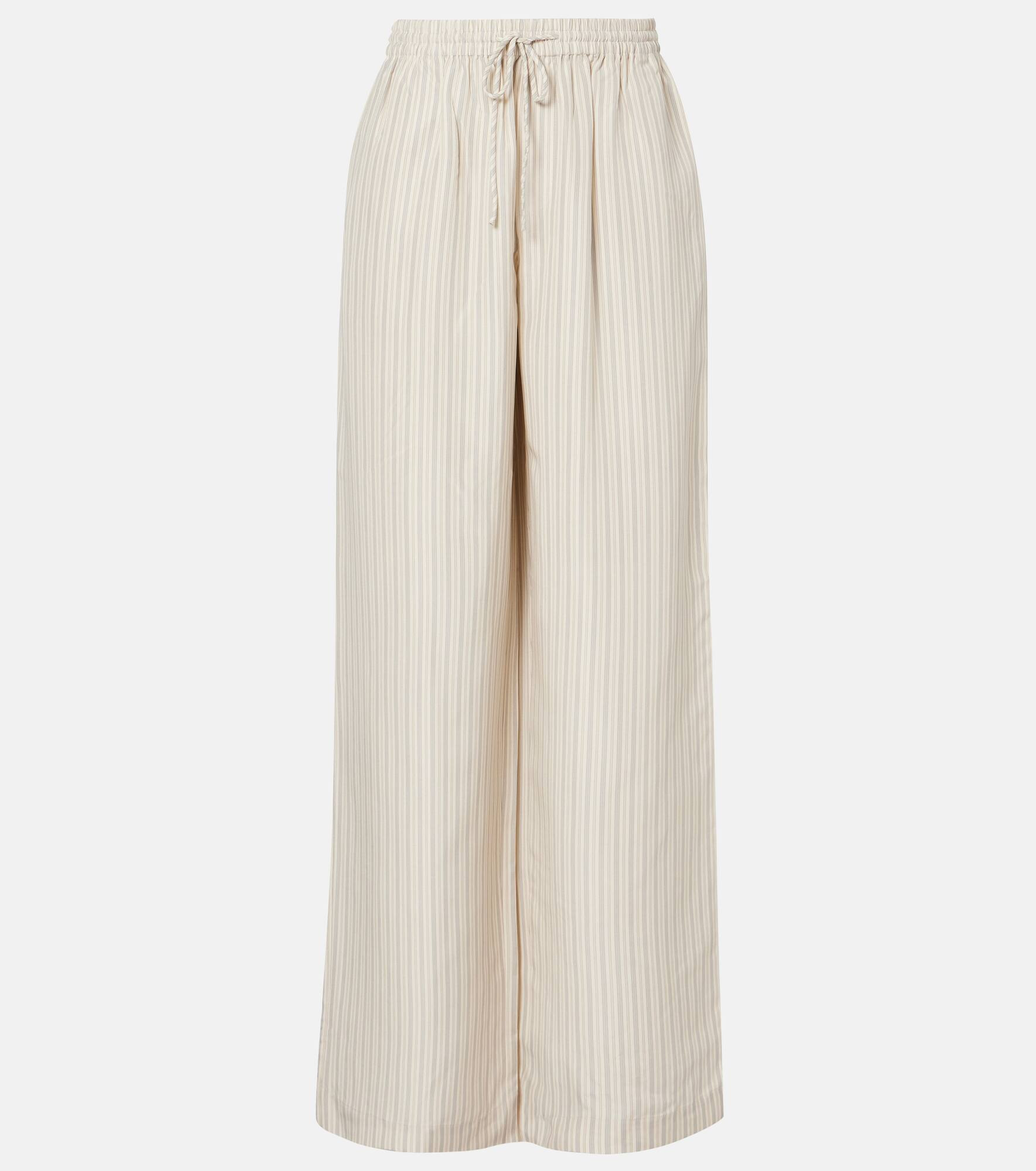 Rohe favors a multifaceted approach to design, infusing every collection with elements of Dutch art and architecture. These elegant wide-leg pants are constructed from featherweight striped silk and feature an elasticated drawstring waist for comfort. Product Details - Material: 100% silk - Care instructions: dry clean - Made in Italy - Designer color name: Classic Stripe - Item color: beige, multicolor - Elasticated drawstring waist - Pockets: side slit pockets - Item number: P01073418 Size & Fit - True to size - Elasticated waist - Adjustable at the waist - Non-stretchy fabric - Wide-leg - The model seen in the picture is 178cm-5'10" and wearing a size FR 34