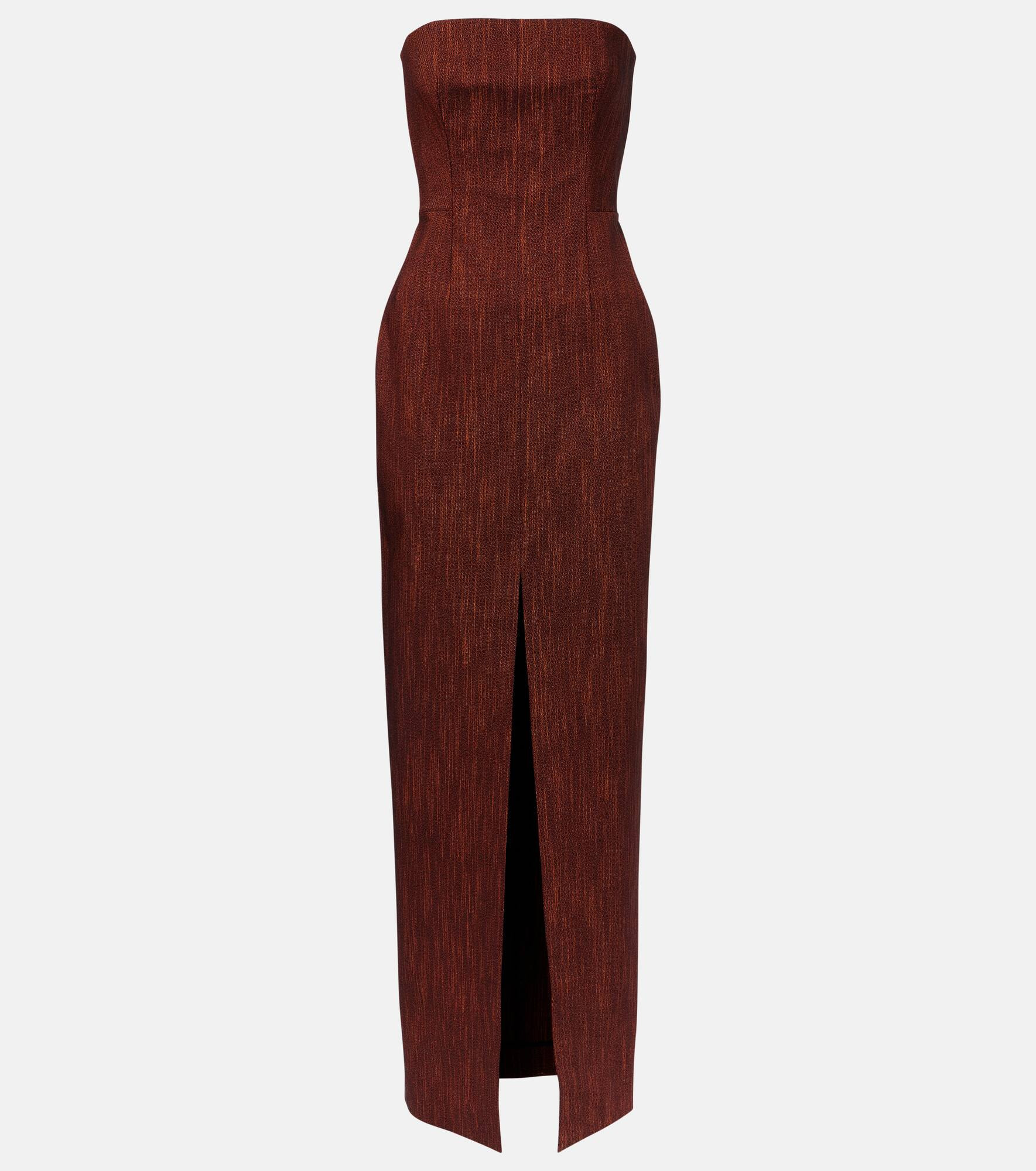 Roksanda Ilinčić’s background in architecture informs her brand’s distinctive approach to fashion design. Made from wool and cotton, the Shani gown has a bustier bodice and concealed zipper fastening at the back. Product Details - Material: 84% wool, 15% cotton, 1% elastane - Care instructions: specialist clean - Made in Slovakia - Designer color name: Blood Orange - Item color: orange - Trim: 100% polyamide - Closure: concealed zipped back - Long vent - Built-in bustier - Item number: P01077482 Size & Fit - Fits large to size - we recommend trying one size smaller - Strapless - Internal boned corset for support - Fitted - Non-stretchy fabric - The model seen in the picture is 178cm-5'10" and wearing a size UK 6