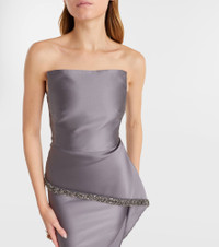 Celebrate life’s special occasions in confidence and grace with Roland Mouret’s iconic designs. Cut from elegant taffeta, this gown has a peplum silhouette adorned with crystal embellishments and a strapless bodice. Product Details - Material: 85% polyester, 15% silk - Care instructions: dry clean - Made in China - Designer color name: Grey - Item color: gray - Lining: 100% polyester - Lining II: 84% polyester, 16% elastane - Hook-fastening built-in bustier - Boning - Closure: zipped back - Trim: 100% crystals - Long vent - Item number: P01125092 Size & Fit - True to size - Strapless - Internal boned corset for support - Fitted - Non-stretchy fabric - slit length 68cm-27" - The model seen in the picture is 178cm-5'10" and wearing a size UK 6