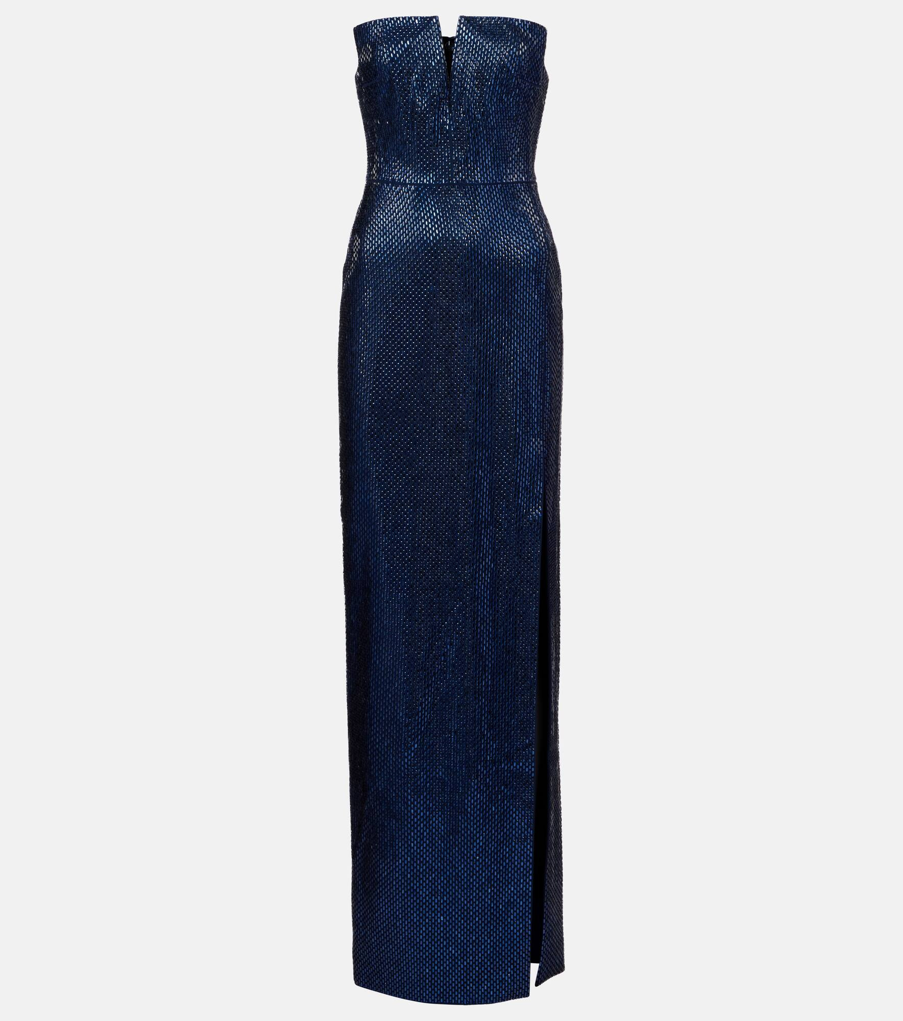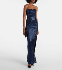 This strapless gown from Roland Mouret is a shiny go-to for memorable events. Made from crepe, its design is shaped with a sheath silhouette, and the embellished front features a deep side slit. Product Details - Material: 95% polyamide, 5% elastane - Care instructions: dry clean - Made in China - Designer color name: Navy - Item color: blue - Material II: 100% polyester - Material III: 84% polyester, 11% viscose, 5% elastane - Lining: 100% polyester - Lining II: 84% polyester, 16% elastane - Hook-fastening built-in bustier - Item number: P01060427 Size & Fit - Fits large to size - we recommend trying one size smaller - Strapless - Cinched waist - Non-stretchy fabric - The model seen in the picture is 178cm-5'10" and wearing a size UK 6