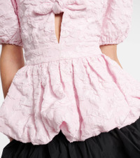 This Rotate top brings romantic charm with its delicate jacquard pattern and peplum design. Its V-neckline is finished with a bow and a cutout detail, and the balloon silhouette and sleeves create a flattering, puffy look. Product Details - Material: 55% polyester (recycled), 40% elastomultiester, 5% polyester - Care instructions: machine wash at 30 degrees - Made in China - Designer color name: Ballerina - Item color: pink - Closure: concealed zipper - Collar: V-neck - Item number: P01086840 Size & Fit - True to size - Oversized shoulders - Cinched waist - Non-stretchy fabric - Falls to the hip - The model seen in the picture is 178cm-5'10" and wearing a size DE 34