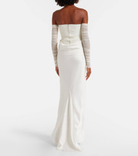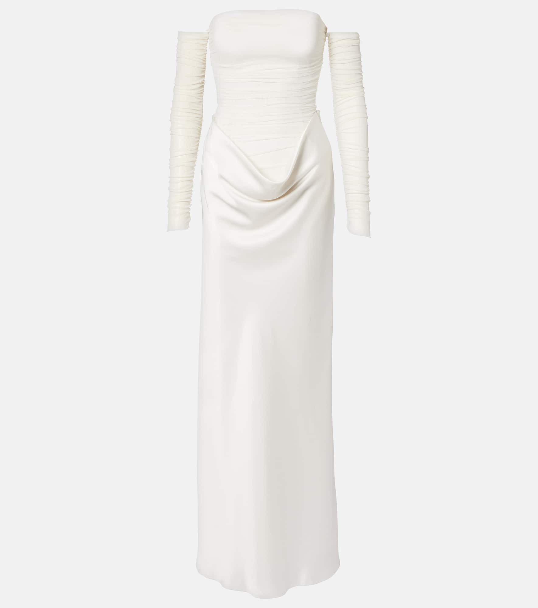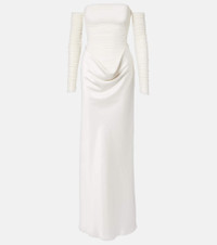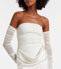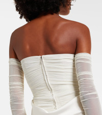Fill the gaps in your going-out wardrobe with unique and glamorous styles from Rotate. The Donatella gown is designed with detachable ruched sleeves and a sculptural strapless silhouette that boasts an elegant draping. Product Details - Material: 60% polyester (recycled), 40% polyester - Care instructions: hand wash - Made in China - Designer color name: Snow White - Item color: white - Interlining: 95% polyester, 5% elastane - Lining: 95% polyester, 5% elastane - Closure: zipped back - Detachable sleeves - Hem: uneven - Item number: P01105593 Size & Fit - True to size - Off-the-shoulder - Fitted - Partly stretchy fabric - The model seen in the picture is 178cm-5'10" and wearing a size DE 34