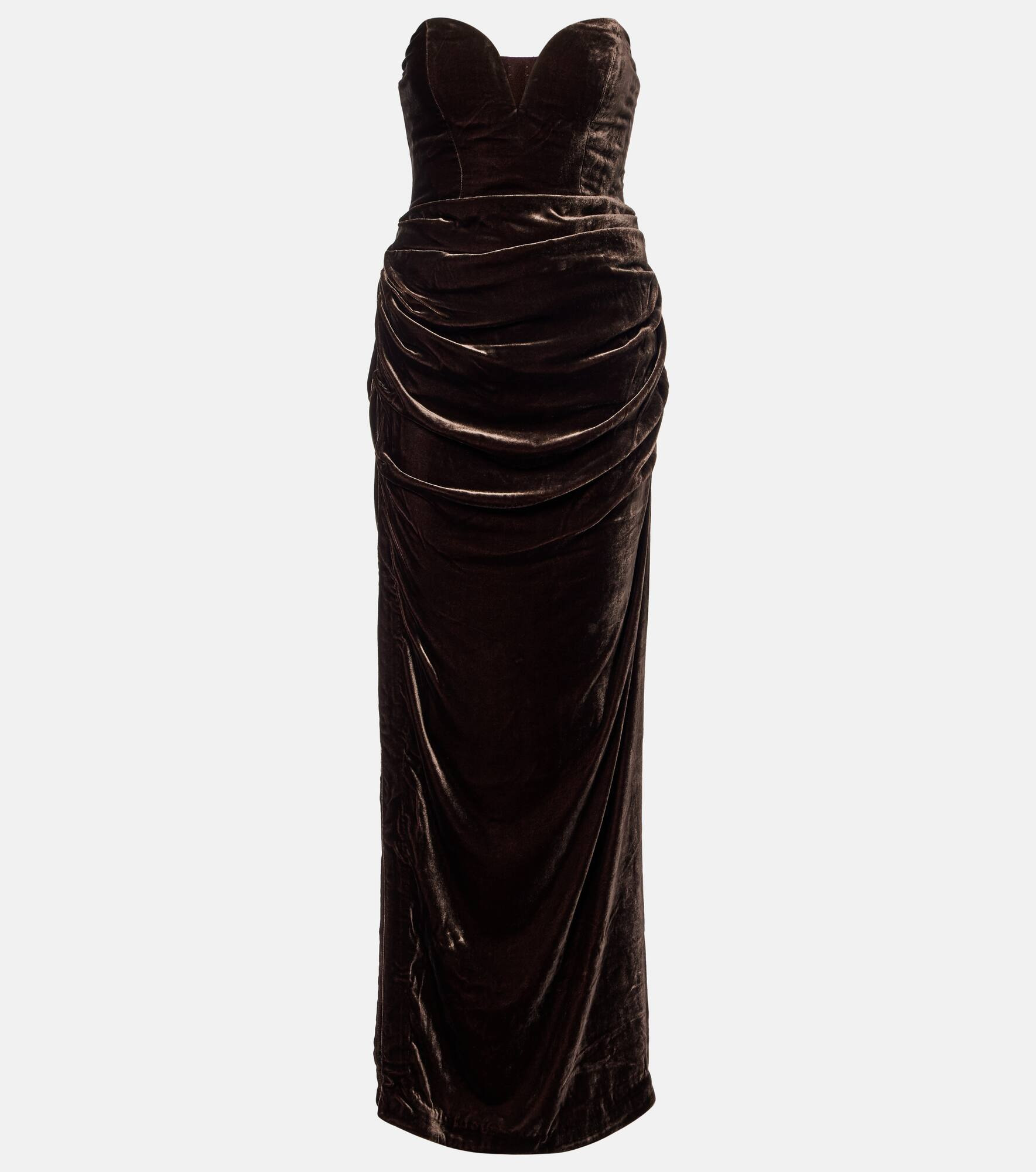 Fill the gaps in your going-out wardrobe with unique and glamorous styles from Rotate. This elegant bustier gown is crafted from soft, decadent velvet to a classic column silhouette and features a draped waist. Product Details - Material: 82% viscose, 18% silk - Care instructions: dry clean - Made in China - Designer color name: Chocolate Brown - Item color: brown - Lining: 92% polyester, 8% elastane - Hardware color: silver - Hook-fastening built-in bustier - Underwired cups - Boning - Closure: concealed zipped back, hook-fastening back - Side slits - Item number: P01113124 Size & Fit - True to size - Strapless - Internal corset with underwire support - Fitted - Non-stretchy fabric - Padded top - The model seen in the picture is 178cm-5'10" and wearing a size DE 34