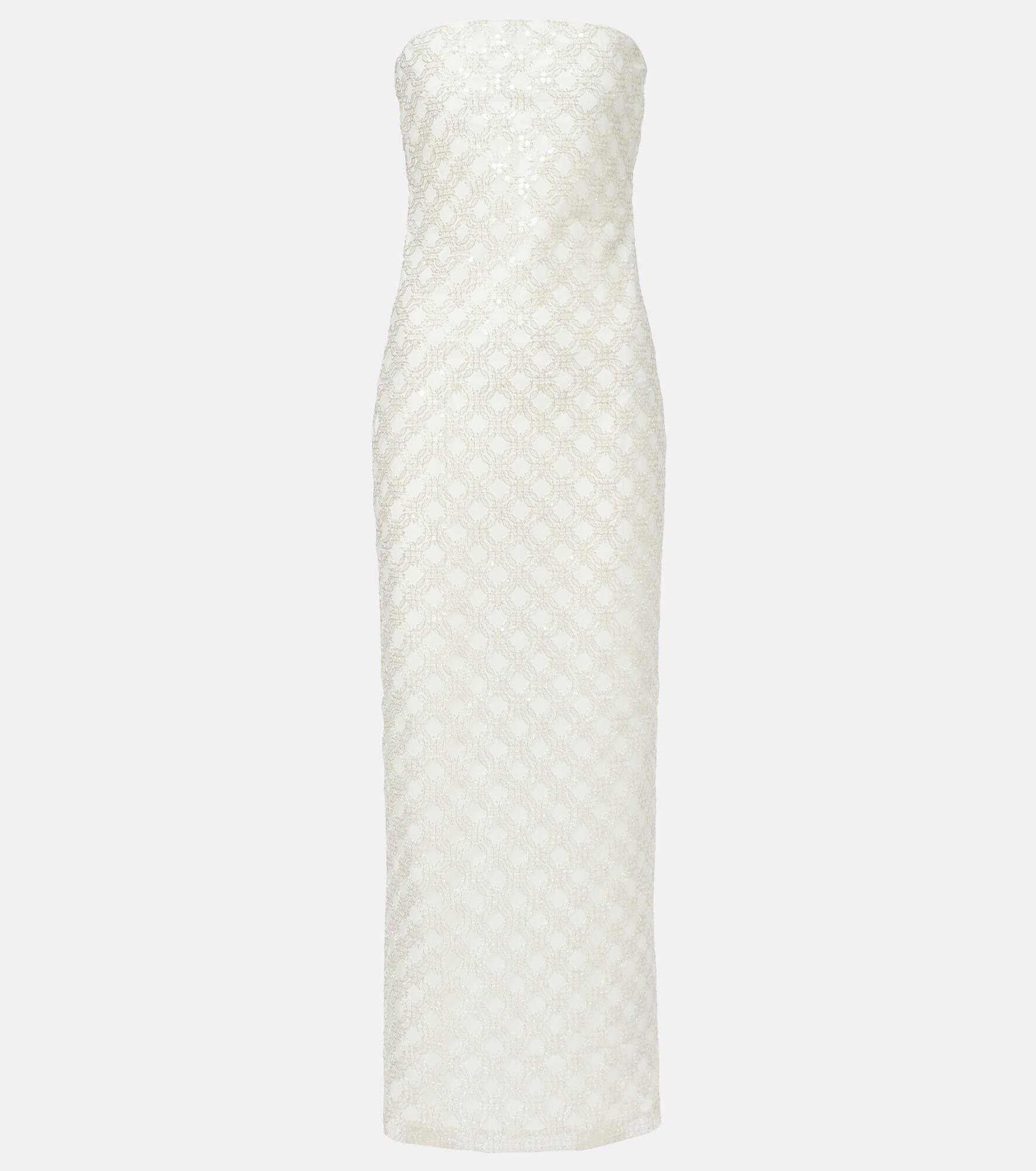 Fill the gaps in your going-out wardrobe with unique and glamorous styles from Rotate. This dazzling maxi dress comes in a strapless silhouette and is complete with an array of embellishments, including beads and sequins that catch the light. Product Details - Material: 100% polyester (recycled) - Care instructions: dry clean - Made in China - Designer color name: Egret - Item color: white - Lining: 100% polyester - Details: 100% polyester - Closure: hook-fastening back, zipped back - Long vent - Item number: P01086823 Size & Fit - True to size - Strapless - Semi-sheer - Fitted - Non-stretchy fabric - slit length 58,0cm-23" - The model seen in the picture is 178cm-5'10" and wearing a size DE 34