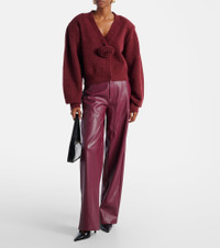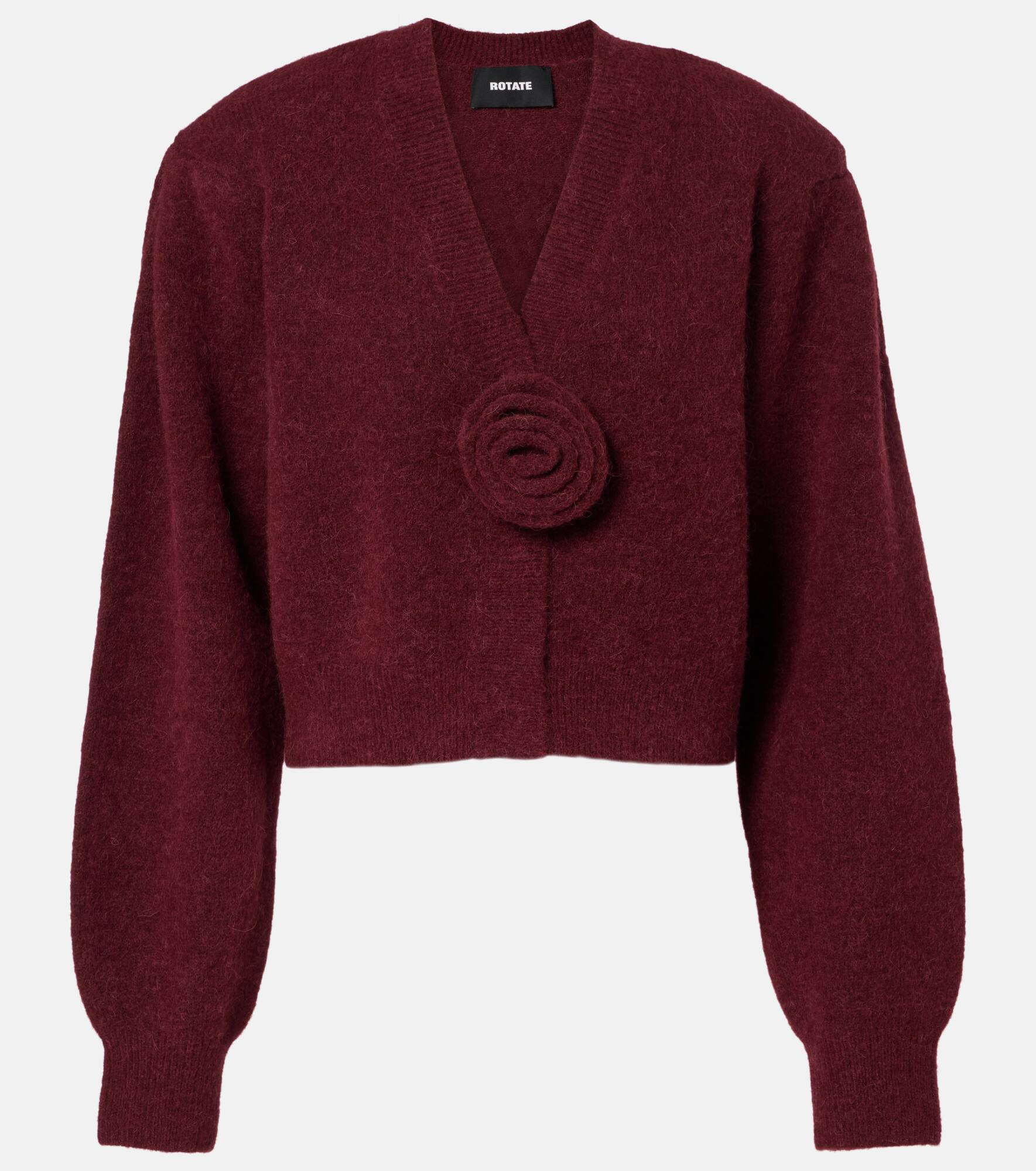 Fill the gaps in your going-out wardrobe with unique and glamorous styles from Rotate. Crafted from a soft wool blend, this cardigan is cut to a cropped silhouette and features a knit floral-applique detail at the center. Product Details - Material: 32% alpaca wool, 32% wool, 30% polyester, 6% elastane - Care instructions: hand wash - Made in China - Designer color name: Zinfandel - Item color: burgundy - Closure: snap-buttoned front - Cuff: ribbed - Includes: brooch - Item number: P01086843 Size & Fit - True to size - Oversized shoulders - Shoulder pad inserts - Dropped shoulders - Cinched waist - Stretchy fabric - Slightly cropped - The model seen in the picture is 178cm-5'10" and wearing a size XS