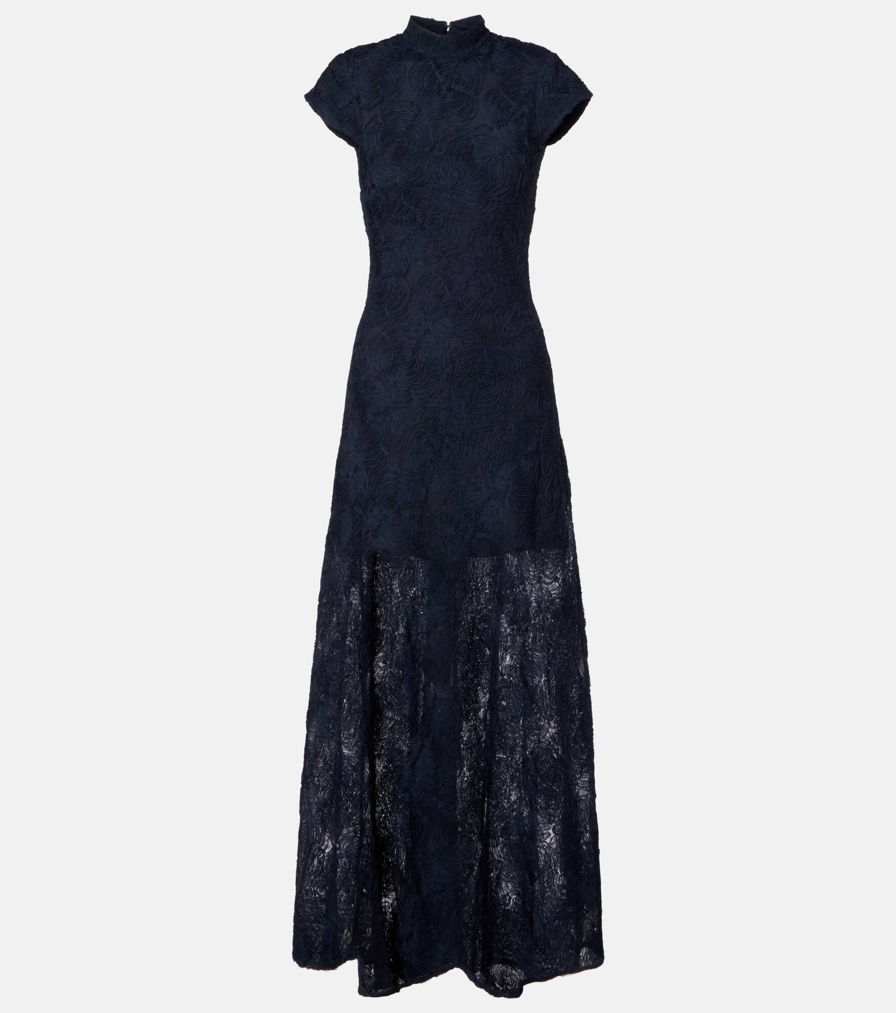 Fill the gaps in your going-out wardrobe with unique and glamorous styles from Rotate. Crafted from mesh, this cap-sleeve, high-neck gown is detailed with tonal florals for a subtle yet sophisticated edge. Product Details - Material: 95% polyester (recycled), 5% elastane - Care instructions: dry clean - Made in China - Designer color name: Navy - Item color: blue - Material II: 100% polyester (recycled) - Lining: 88% polyester, 12% elastane - Closure: concealed zipped back - Detachable shoulder pads - Item number: P01113103 Size & Fit - True to size - Shoulder pad inserts - Cinched waist - Non-stretchy fabric - The model seen in the picture is 178cm-5'10" and wearing a size DE 34