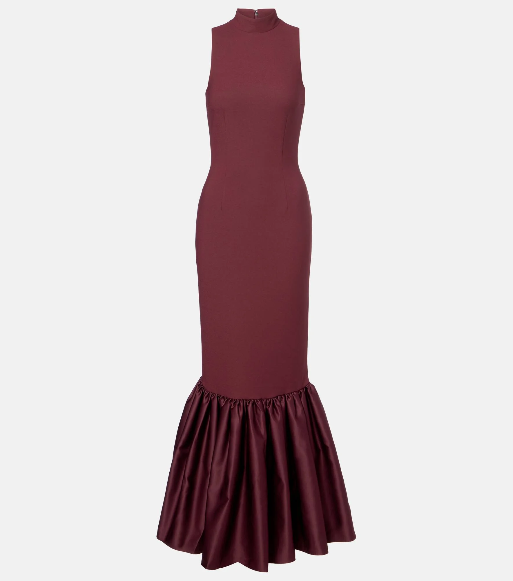 Fill the gaps in your going-out wardrobe with unique and glamorous styles from Rotate. This maxi dress is cut to a fitted silhouette and infused with a hint of stretch, complemented by a gathered flared hem. Product Details - Material: 95% polyester (recycled), 5% elastane - Care instructions: hand wash - Made in China - Designer color name: Zinfandel - Item color: burgundy - Hardware color: silver - Lining: 95% polyester, 5% elastane - Collar: mockneck - Closure: concealed zipped back - Item number: P01113763 Size & Fit - True to size - Fitted - Slightly stretchy fabric - The model seen in the picture is 178cm-5'10" and wearing a size DE 34