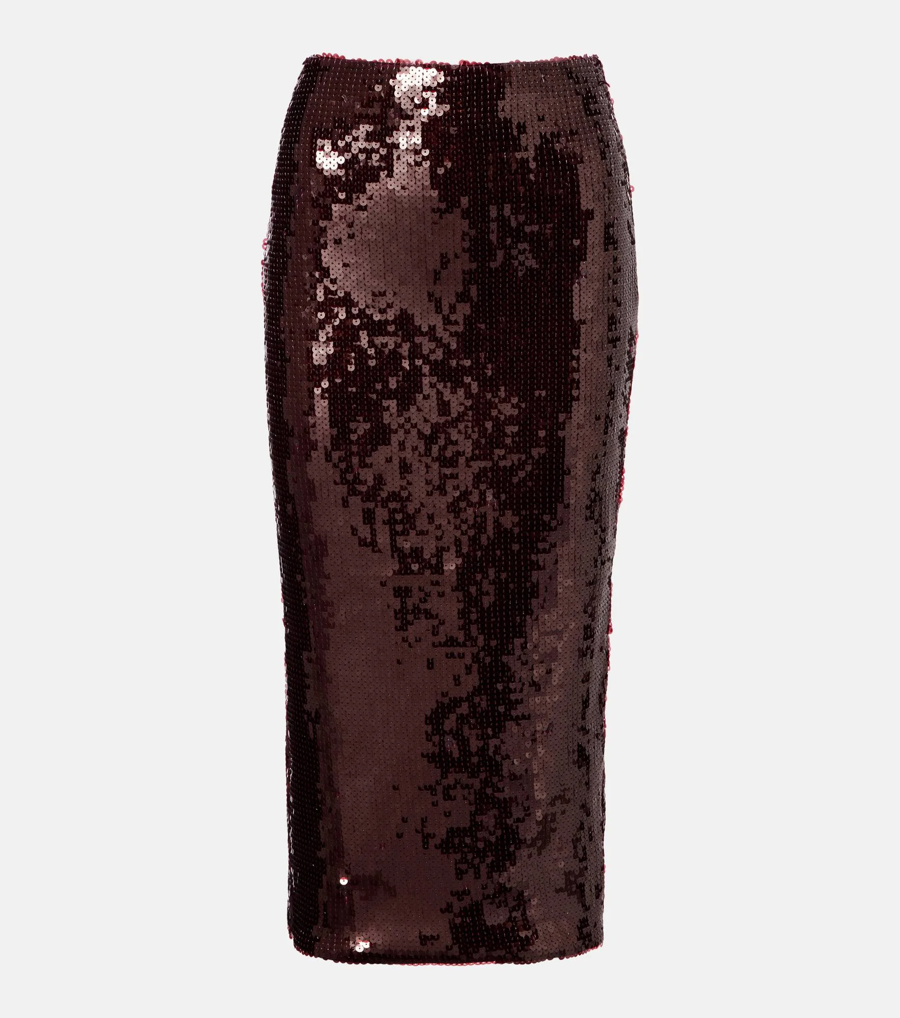 Fill the gaps in your going-out wardrobe with unique and glamorous styles from Rotate. The Georgia pencil skirt is tailored to a midi silhouette with a back slit and flaunts striking sequin embellishments. Product Details - Material: 100% polyester (recycled) - Care instructions: dry clean - Made in China - Designer color name: Zinfandel - Item color: burgundy - Material II: 100% polyester (recycled) - Lining: 88% polyester, 12% elastane - Closure: zipped back - Long vent - Fully lined - Item number: P01105583 Size & Fit - True to size - Stretchy fabric - slit length 32cm-12.5" - The model seen in the picture is 178cm-5'10" and wearing a size DE 34