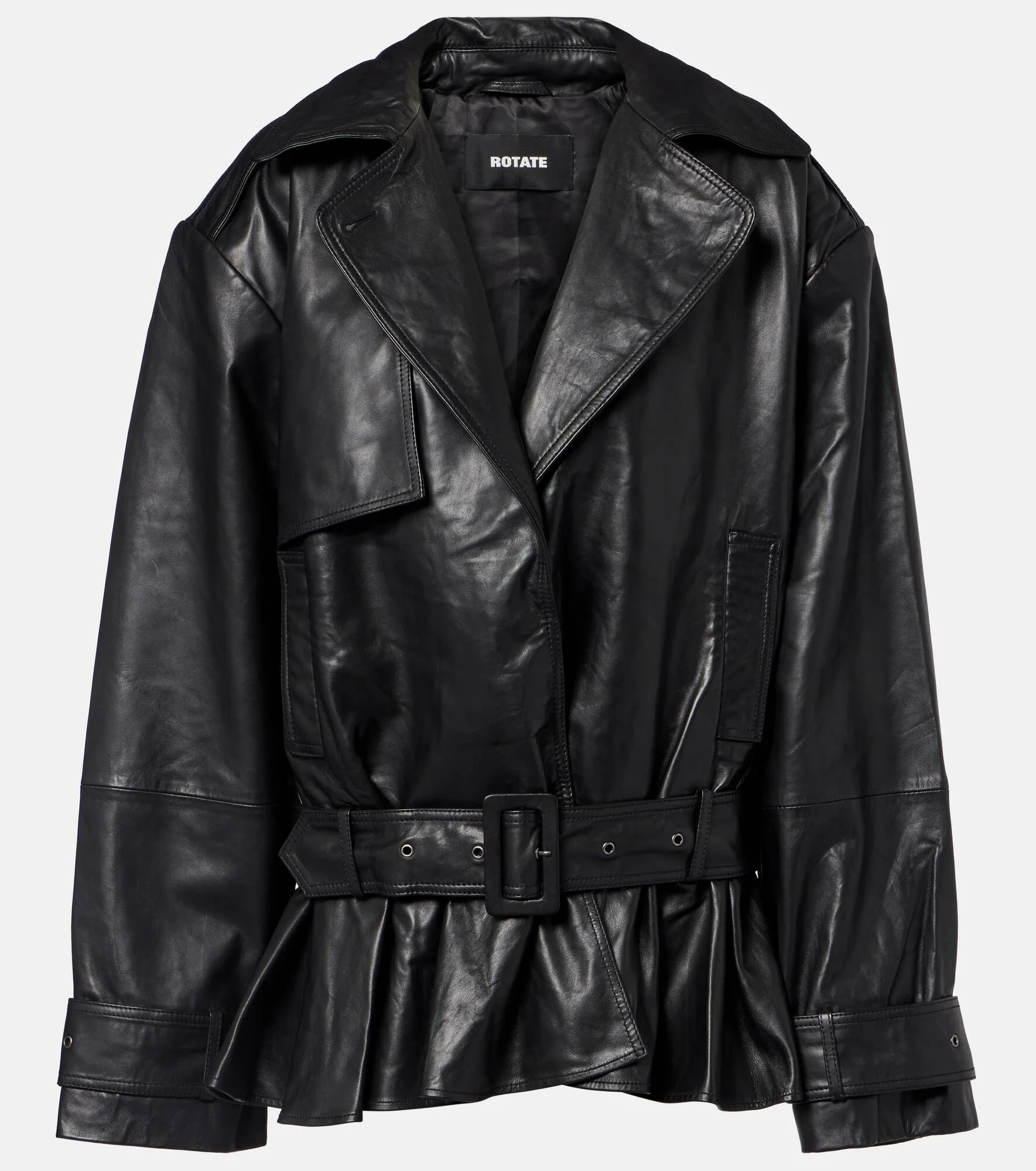 Fill the gaps in your going-out wardrobe with unique and glamorous styles from Rotate. Made from black leather, this biker jacket is defined by its peplum silhouette, detachable belt, and silver-toned hardware. Product Details - Material: 100% lamb leather - Care instructions: specialist clean - Made in India - Designer color name: Black - Item color: black - Lining: 100% polyester (recycled) - Hardware color: silver - Notched lapel - Epaulettes - Pockets: welt pockets, internal pocket - Belt loops - Detachable belt - Cuff: strap, buckle and loops - Item number: P01105603 Size & Fit - Fits large to size - we recommend trying one size smaller - Dropped shoulders - Adjustable at the waist - Oversized - Non-stretchy fabric - Falls below the hip - The model seen in the picture is 178cm-5'10" and wearing a size DE 32