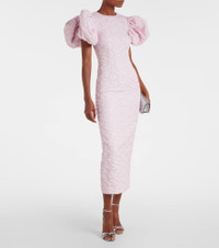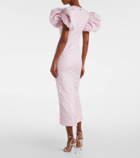 Fill the gaps in your going-out wardrobe with unique and glamorous styles from Rotate. Made from a textured jacquard fabric, this midi dress is enriched with voluminous puff sleeves and a short vent at the back. Product Details - Material: 55% polyester (recycled), 40% elastomultiester, 5% polyester - Care instructions: machine wash at 30 degrees - Made in China - Designer color name: Ballerina - Item color: pink - Lining: 97% viscose, 3% elastane - Short vent - Cuff: elasticated - Closure: concealed zipper, zipped back, hook-fastening back - Hardware color: silver - Item number: P01086841 Size & Fit - True to size - Oversized shoulders - Fitted - Non-stretchy fabric - slit length 46cm-18" - The model seen in the picture is 178cm-5'10" and wearing a size DE 34