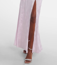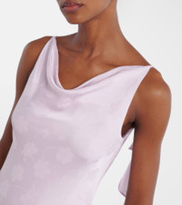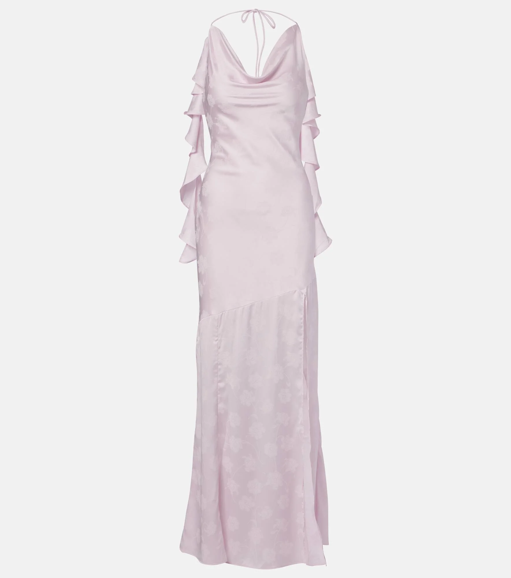 Fill the gaps in your going-out wardrobe with unique and glamorous styles from Rotate. Crafted from floral-patterned jacquard, this gown boasts a flowing silhouette with a draped neckline, a self-tie halter neckline, and elegant ruffle details. Product Details - Material: 100% polyester (recycled) - Care instructions: hand wash - Made in China - Color: purple - Designer color name: Orchid Ice - Item color: pink - Lining: 92% polyester, 8% elastane - Item number: P01133435 Size & Fit - True to size - Cinched waist - Non-stretchy fabric - The model seen in the picture is 178cm-5'10" and wearing a size DE 34
