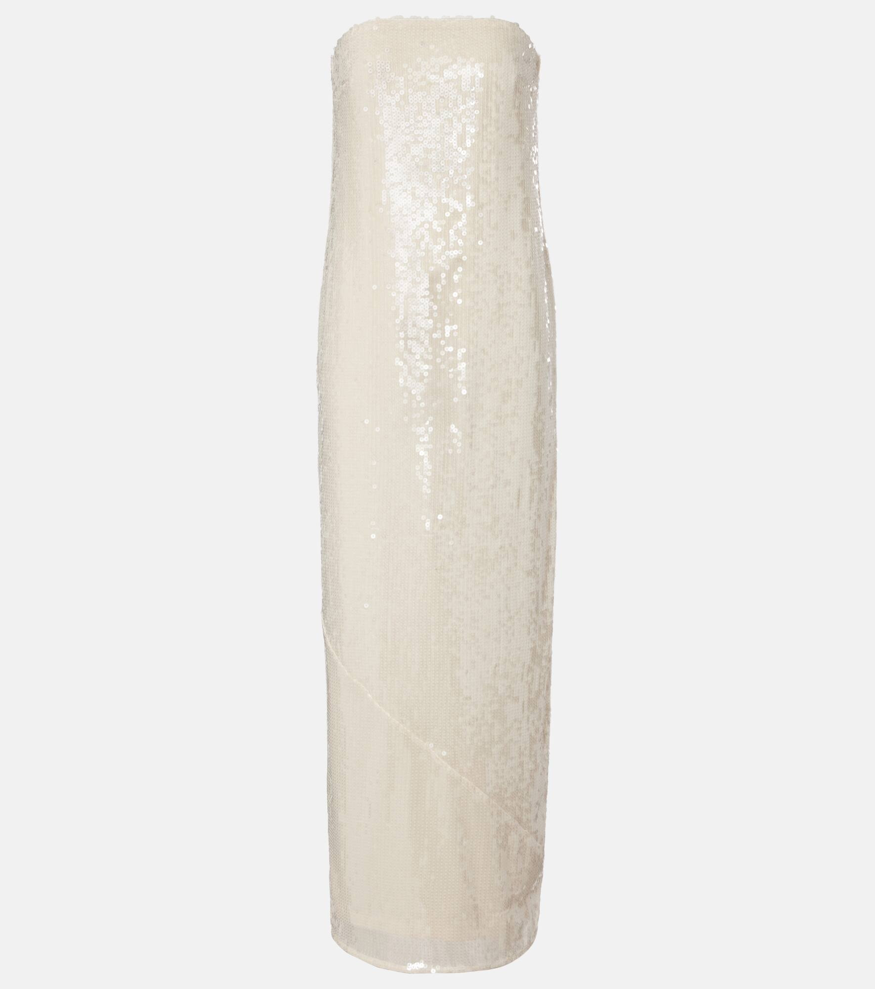 This Rotate maxi dress will put you in the spotlight with its sequined silhouette that creates a shiny finish. Its design comes with a strapless bodice and the back features a zip fastening and a deep slit. Product Details - Material: 95% polyester (recycled), 5% elastane - Care instructions: dry clean - Made in China - Designer color name: Egret - Item color: white - Material II: 100% polyester (recycled) - Lining: 88% polyester, 12% elastane - Hardware color: silver - Closure: zipped back - Long vent - Fully lined - Item number: P01086838 Size & Fit - True to size - Strapless - Straight fit - Slightly stretchy fabric - The model seen in the picture is 178cm-5'10" and wearing a size DE 34