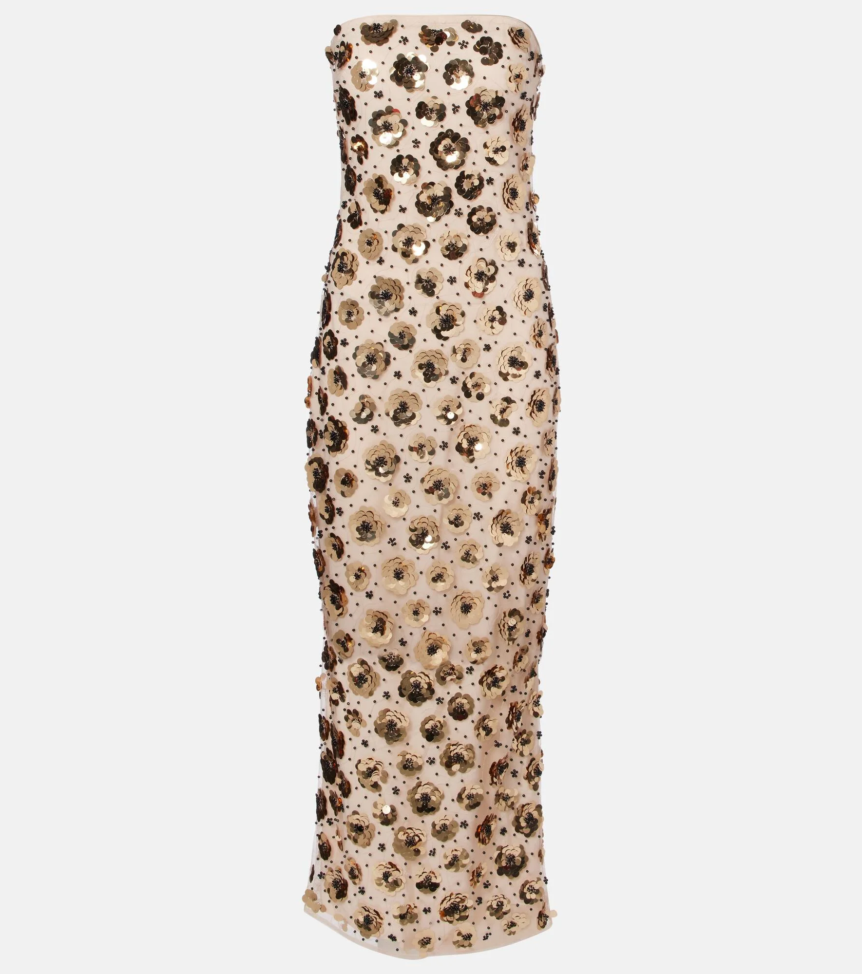 Fill the gaps in your going-out wardrobe with unique and glamorous styles from Rotate. This beige midi dress features a fitted, strapless silhouette and is embellished with allover sequins. Product Details - Material: 100% polyester - Care instructions: dry clean - Made in China - Designer color name: Brazilian Sand - Item color: beige, gold - Embroidery: 100% polyester - Lining: 100% polyester - Closure: concealed zipped back - Item number: P01118742 Size & Fit - True to size - Strapless - Fitted - Non-stretchy fabric - The model seen in the picture is 178cm-5'10" and wearing a size DE 34