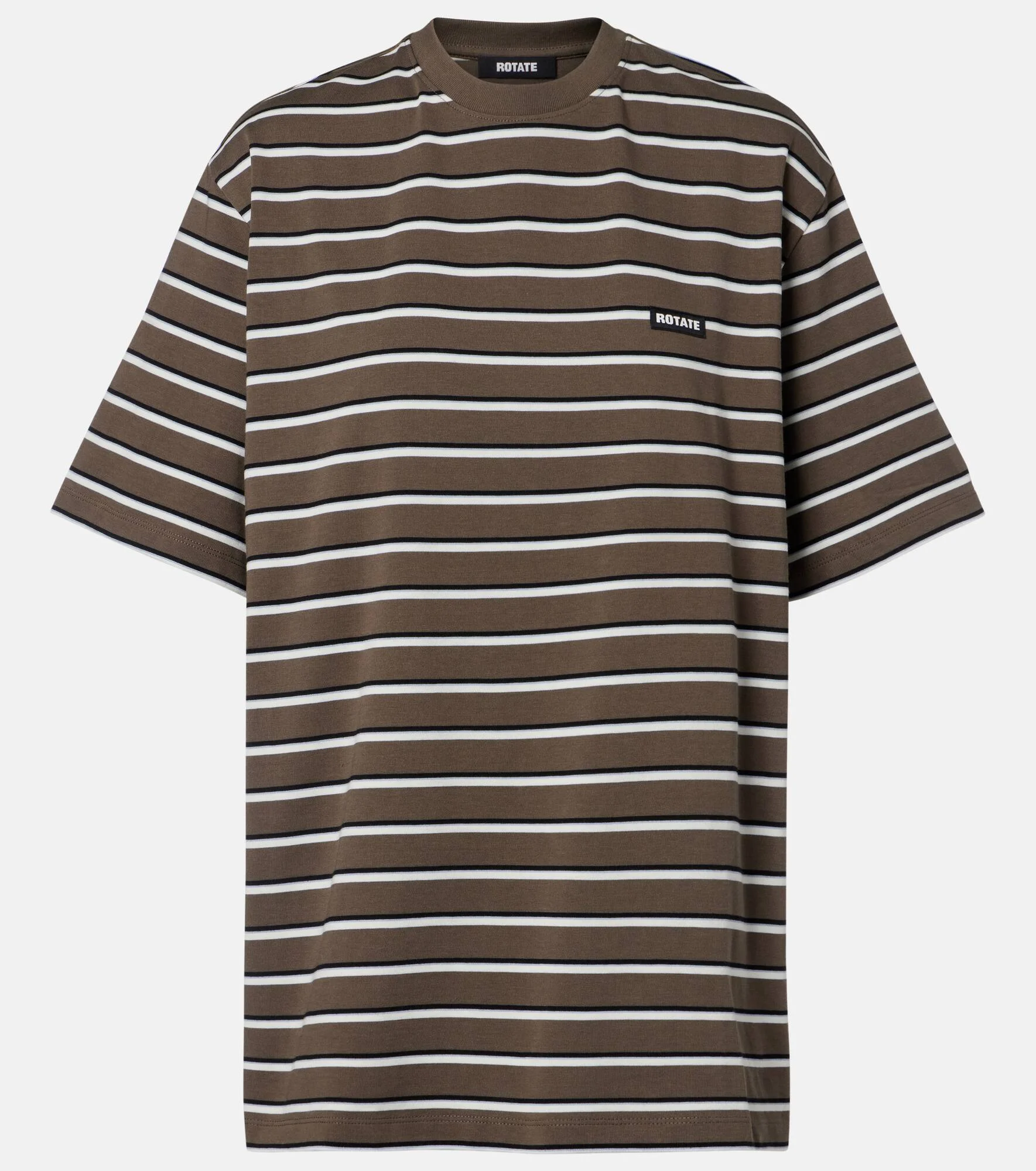 Embrace effortless style with this T-shirt from Rotate. Crafted from soft cotton jersey, this design is cut to an oversized silhouette and boasts an all-over striped print and the brand's logo on the chest. Product Details - Material: 100% cotton (organic) - Care instructions: machine wash at 30 degrees - Made in Turkey - Color: brown - Designer color name: Tarmac Comb. - Item color: green, multicolor - Collar: crewneck - Item number: P01133426 Size & Fit - True to size - For a closer fit, we recommend taking one size down - Dropped shoulders - Oversized - Slightly stretchy fabric - Falls below the hip - The model seen in the picture is 178cm-5'10" and wearing a size XS