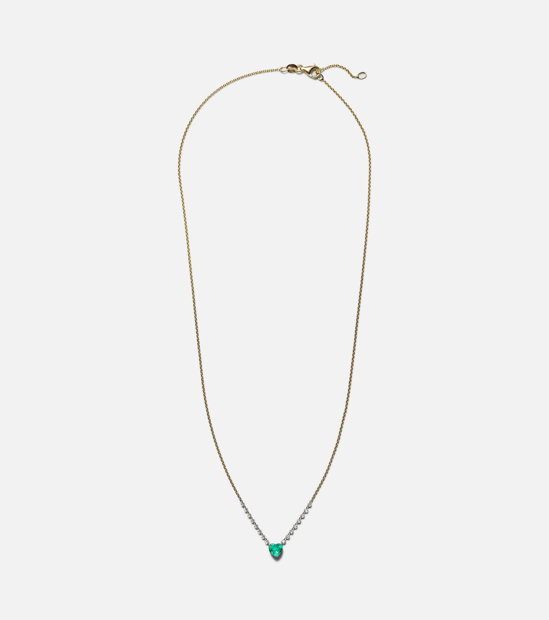Product Details - Material: 18kt yellow gold (750/1000) - Made in the UK - Stone I: white diamonds, round-cut - Color: gold - Stone I carat total weight (ctw): 0.48 - Stone II: emerald, heart-shaped - Stone II carat weight (ct): 0.42 - Item number: P00932161 Size & Fit - Adjustable length - Width 1mm-0.05" - Pendant length 5mm-0.2" - Pendant width 42mm-1.65" - Min. length 40,5cm-16" - Max. length 43cm-17"