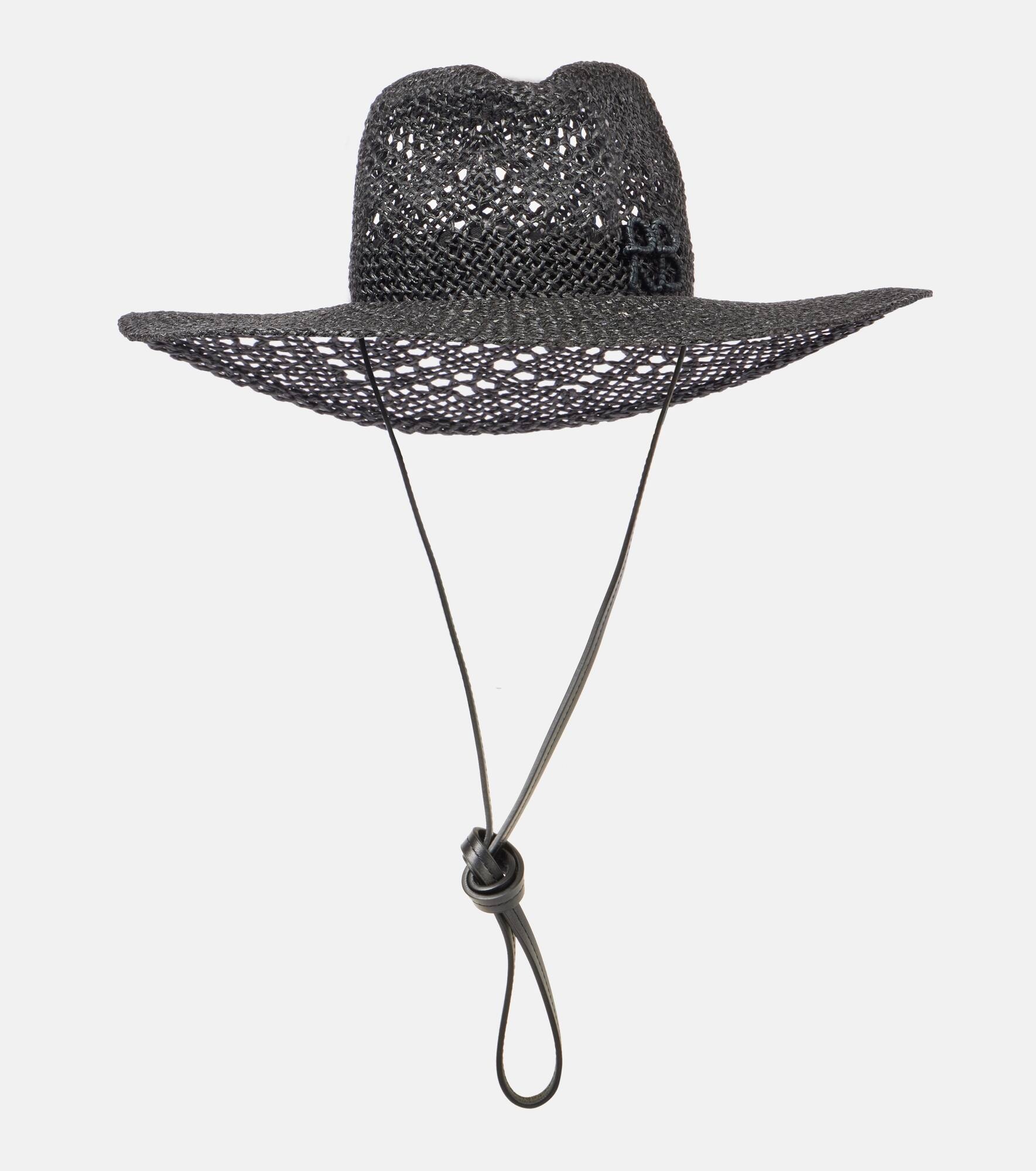 Every piece from Ruslan Baginskiy is crafted locally in the designer's native Ukraine. This straw fedora with chin strap features leather trims and the brand's initials tonally lettered at the front. Product Details - Material: 100% straw - Care instructions: do not wash - Made in Ukraine - Designer color name: Black - Item color: black - Trim: 100% leather - Item number: P01018888 Size & Fit - Width of brim 11cm-4.5"