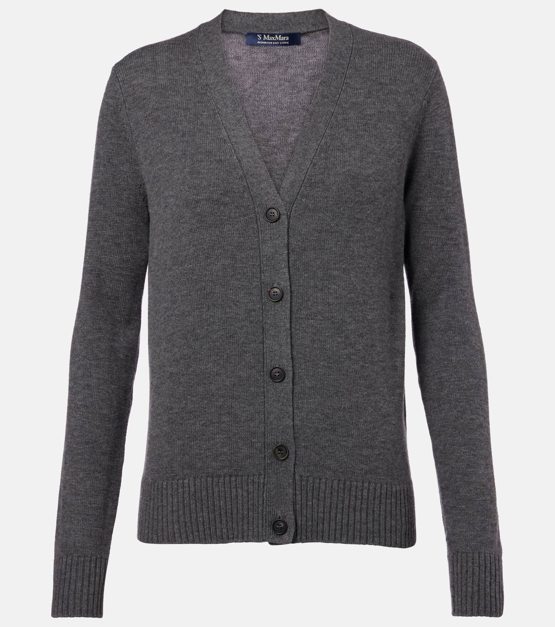 Crafted from pure wool, the Apollo cardigan features a relaxed fit with a flattering V-neckline and rib-knit cuffs and trim. The design is defined by camel-colored knitted elbow patches with the 'S Max Mara logo. Product Details - Material: 100% wool - Care instructions: hand wash - Made in China - Designer color name: Grey Melange - Item color: gray - Contains non-textile parts of animal origin - Closure: buttoned front - Collar: V-neck - Elbow patches - Cuff: ribbed - Hem: ribbed - Item number: P01079046 Size & Fit - True to size - Designed for a loose fit - Stretchy fabric - Falls to the hip - The model seen in the picture is 178cm-5'10" and wearing a size XS