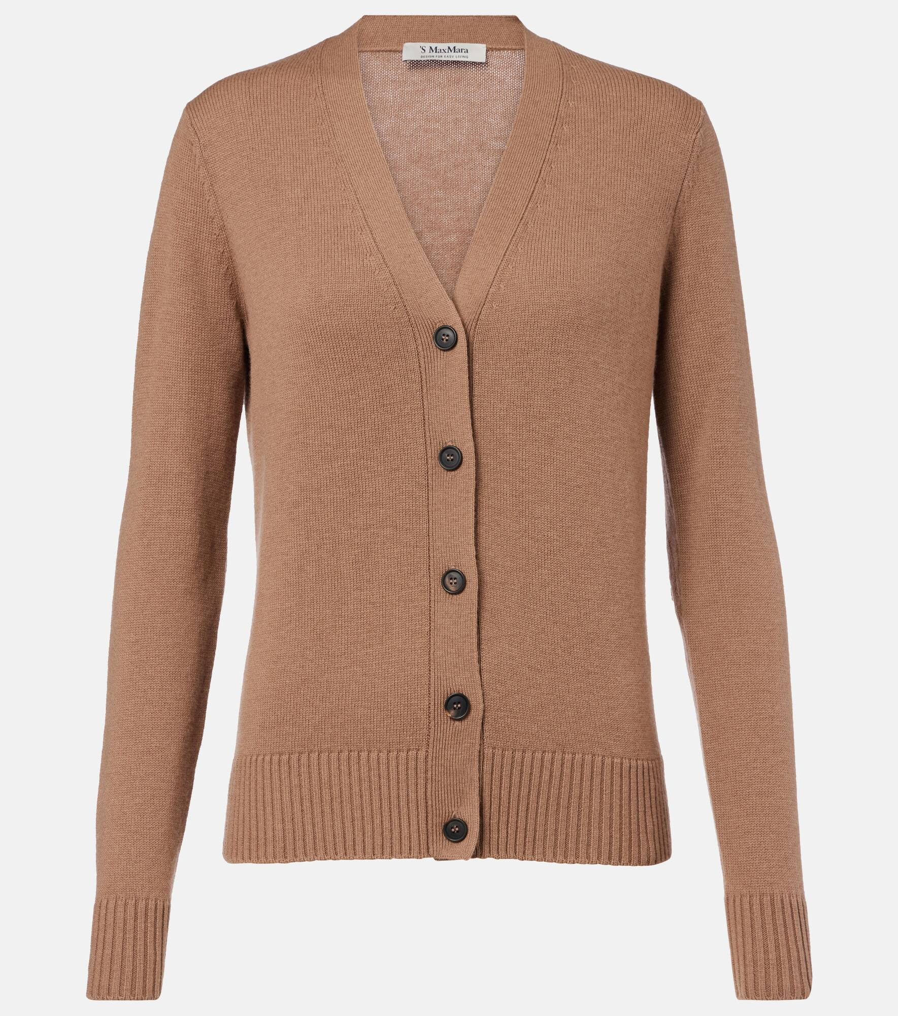 Crafted from pure wool, the Apollo cardigan features a relaxed fit with a flattering V-neckline and rib-knit cuffs and trim. The design is defined by camel-colored knitted elbow patches with the 'S Max Mara logo. Product Details - Material: 100% wool - Care instructions: hand wash - Made in China - Designer color name: Perfect Camel - Item color: brown - Contains non-textile parts of animal origin - Closure: buttoned front - Collar: V-neck - Cuff: ribbed - Hem: ribbed - Elbow patches - Item number: P01079045 Size & Fit - True to size - Designed for a loose fit - Stretchy fabric - Falls to the hip - The model seen in the picture is 178cm-5'10" and wearing a size XS