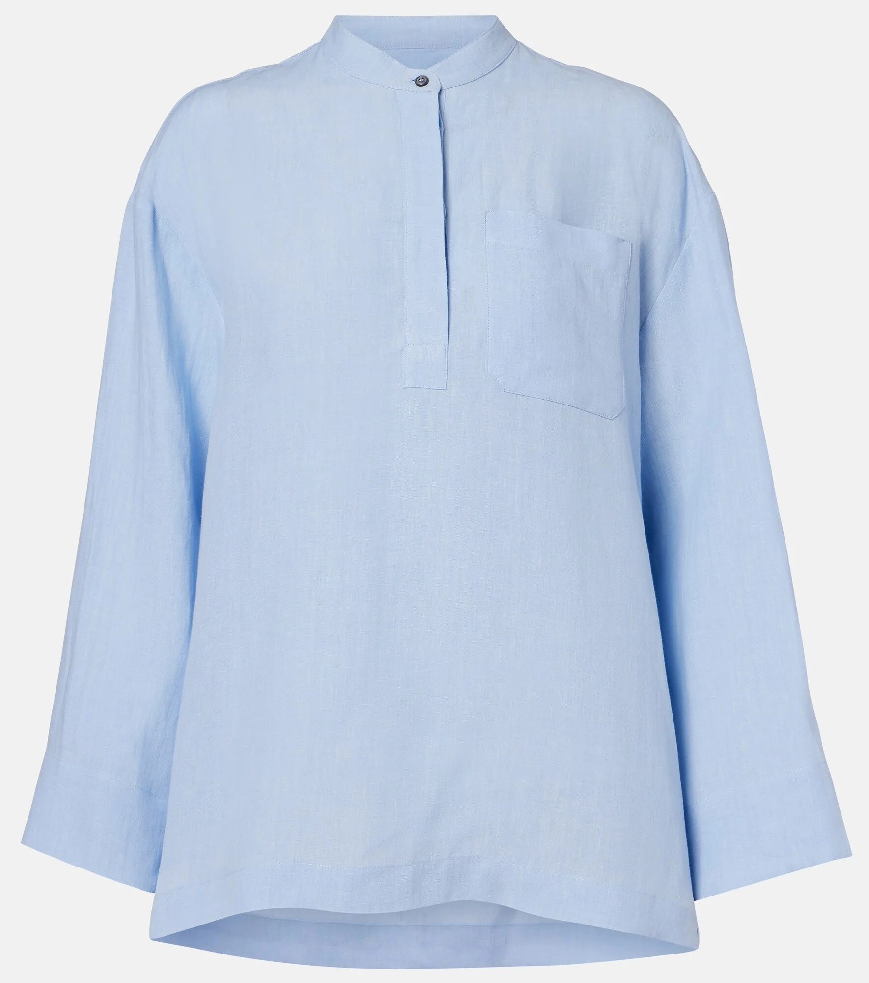'S Max Mara conveys contemporary elegance through streamlined silhouettes and premium fabrics. The Cantico blouse is crafted from pure linen, and the relaxed silhouette is finished with a half-buttoned front. Product Details - Material: 100% linen - Care instructions: hand wash - Made in Romania - Color: blue - Designer color name: Azzurro Breeze - Contains non-textile parts of animal origin - Closure: partially buttoned front - Pockets: chest patch pocket - Side slits - Item number: P01159680 Size & Fit - True to size - Dropped shoulders - Straight fit - Non-stretchy fabric - Falls below the hip - The model seen in the picture is 178cm-5'10" and wearing a size DE 34