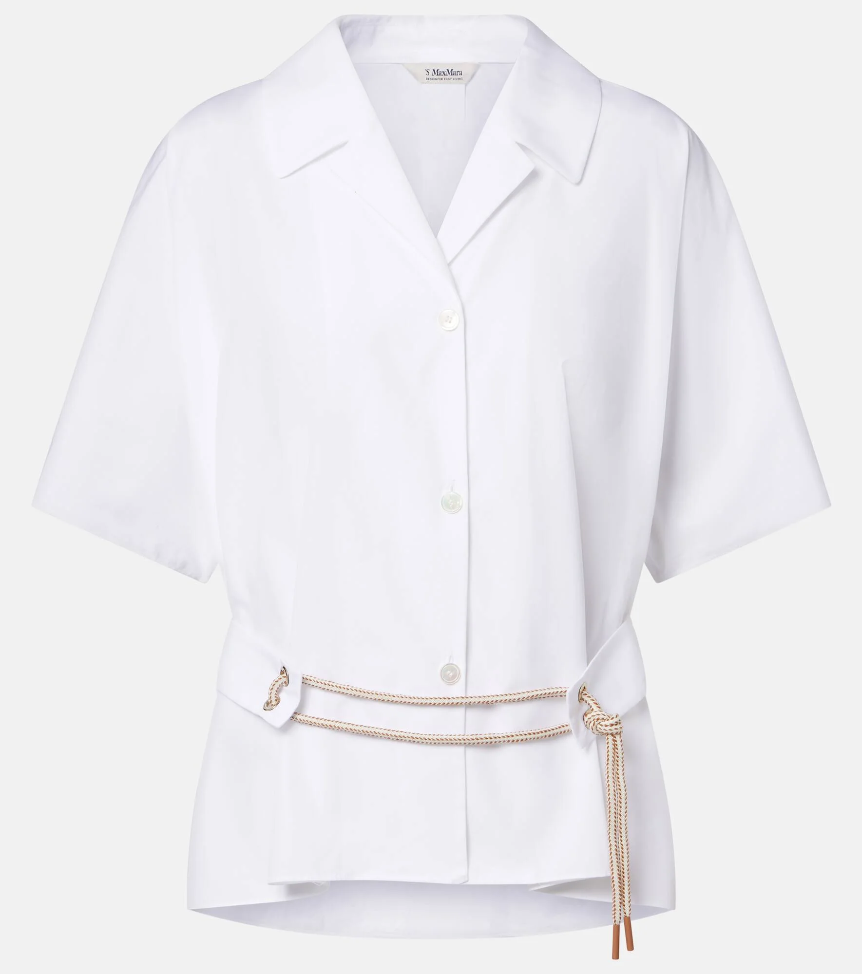 'S Max Mara conveys contemporary elegance through streamlined silhouettes and premium fabrics. Made from cotton poplin, the Carisma shirt is a short-sleeved style with a detachable belt at the waist. Product Details - Material: 100% cotton - Care instructions: dry clean - Made in Romania - Color: white - Designer color name: Bianco Candido - Hardware color: gold - Detachable belt - Closure: buttoned front - Item number: P01159700 Size & Fit - True to size - Loose fit, comes with belt - Non-stretchy fabric - Falls to the hip - The model seen in the picture is 178cm-5'10" and wearing a size DE 34