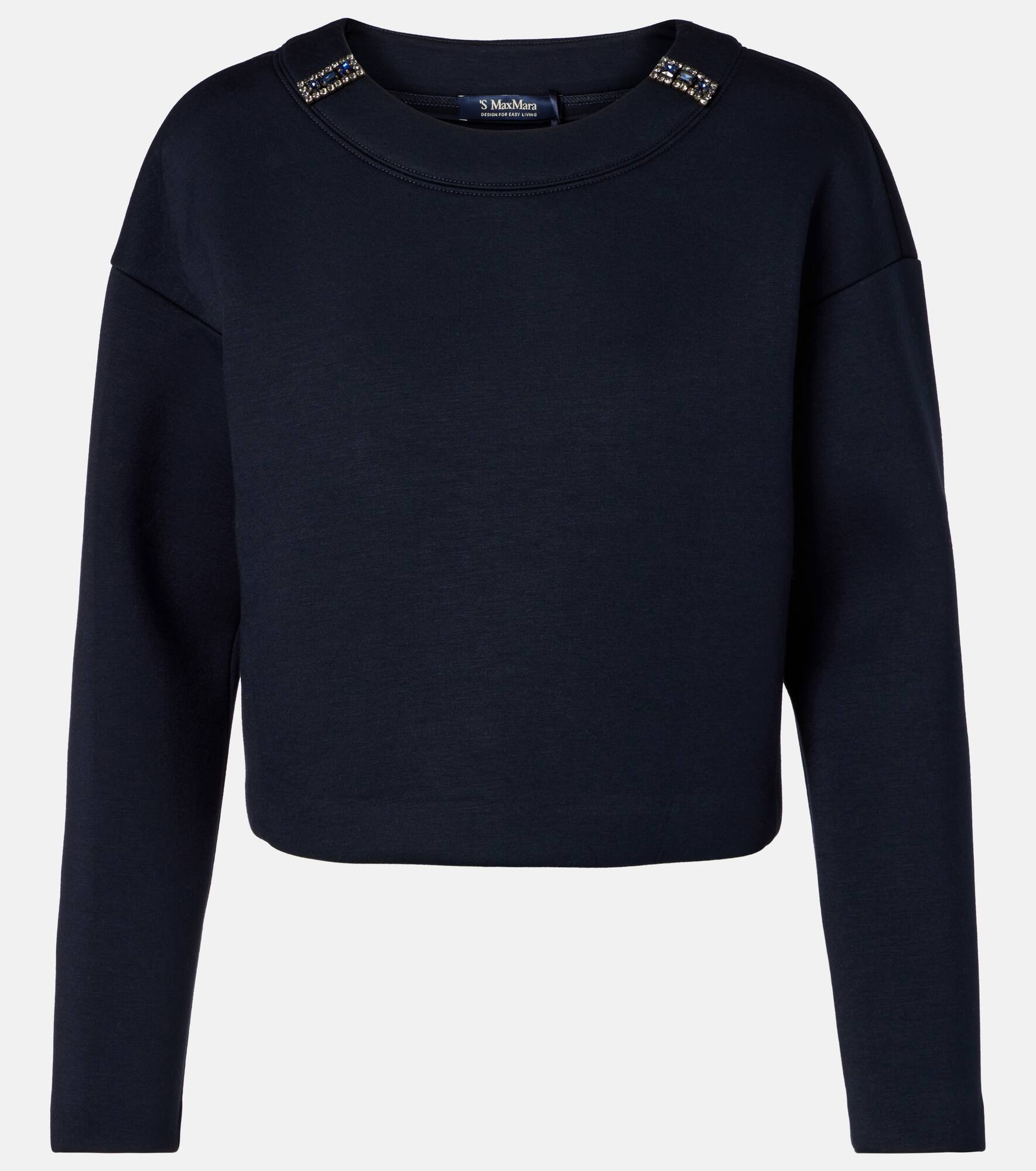 This jersey sweatshirt from 'S Max Mara has a slightly cropped length and a classic crewneck silhouette. The piece has multicolored crystal embellishments on the shoulders. Product Details - Material: 96% viscose, 4% elastane - Care instructions: hand wash - Made in China - Designer color name: Classic Dark - Item color: blue - Item number: P01094716 Size & Fit - True to size - Dropped shoulders - Straight fit - Slightly stretchy fabric - Slightly cropped - The model seen in the picture is 178cm-5'10" and wearing a size XS