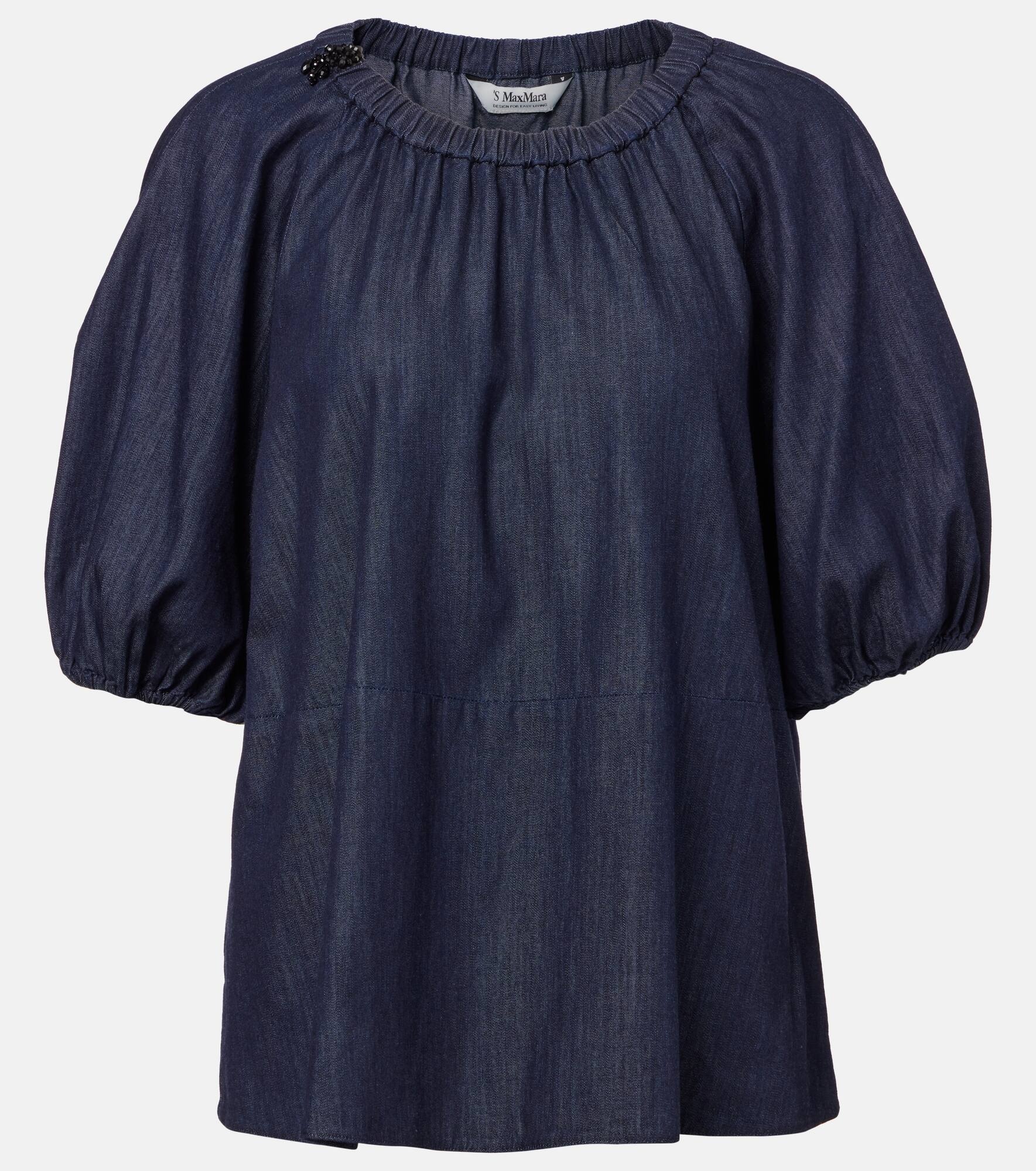 Effortless silhouettes and refined essentials – ‘S Max Mara captures the quiet power of modern, everyday sophistication. The Talia top is made from embellished cotton chambray and has a loose fit with drawstring cuffs and collar. Product Details - Material: 100% cotton - Care instructions: machine wash at 30 degrees - Made in Morocco - Designer color name: Scuro Pulito - Item color: blue - Hardware color: black - Drawstring collar - Drawstring cuffs - Sleeves: ¾ length - Item number: P01079076 Size & Fit - True to size - Designed for a loose fit - Non-stretchy fabric - Falls to the hip - The model seen in the picture is 178cm-5'10" and wearing a size DE 34