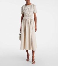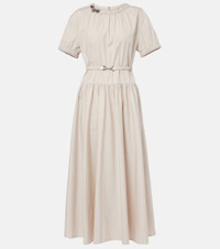Crafted from lightweight cotton poplin, the Terry midi dress from 'S Max Mara features a flowing, pleated skirt with short sleeves. The design is enhanced with a detachable belt at the waist and charming embellishments at the neckline. Product Details - Material: 100% cotton - Care instructions: machine wash at 30 degrees - Made in Romania - Designer color name: Ecru Marmo - Item color: gray - Hardware color: silver - Closure: zipped back - Pockets: side slit pockets - Detachable belt - Item number: P01079038 Size & Fit - True to size - Loose fit, comes with belt - Non-stretchy fabric - The model seen in the picture is 178cm-5'10" and wearing a size DE 34